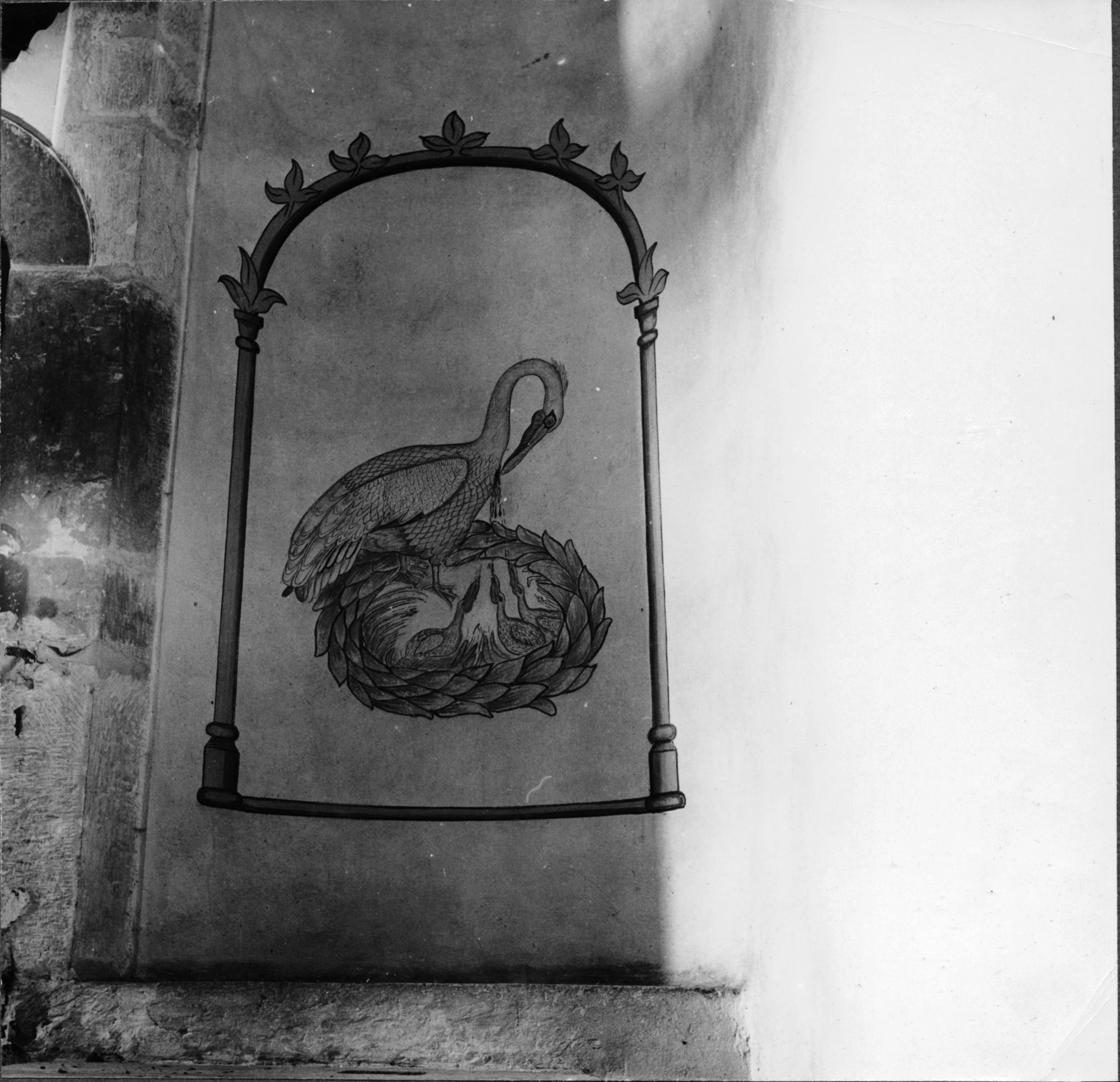• Kalkmålning på östväggen, pelikan i en nisch bakom Olofsaltaret av Gardelin 1895.