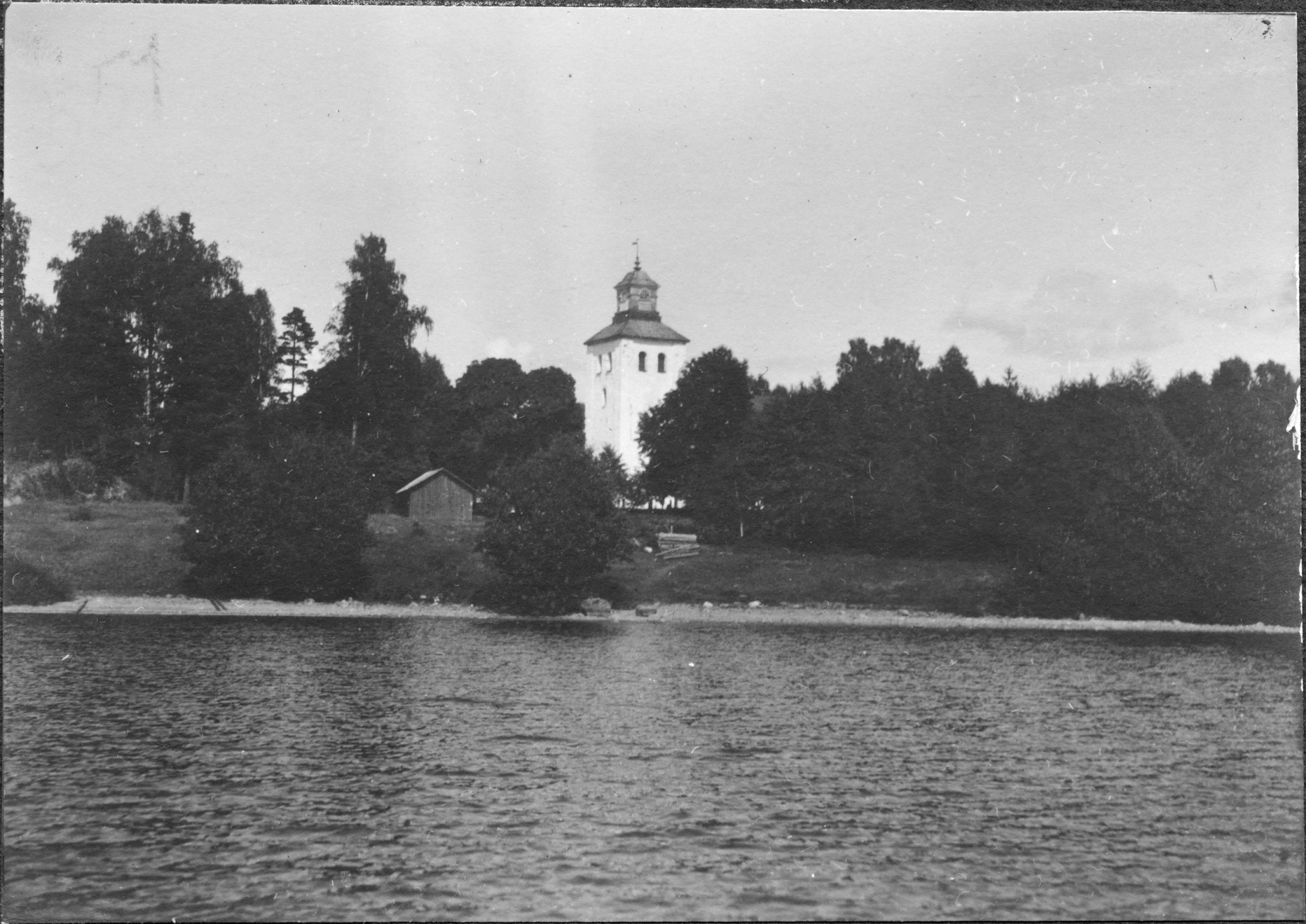• Kyrkan från sydväst med sjön Värmeln i förgrunden.