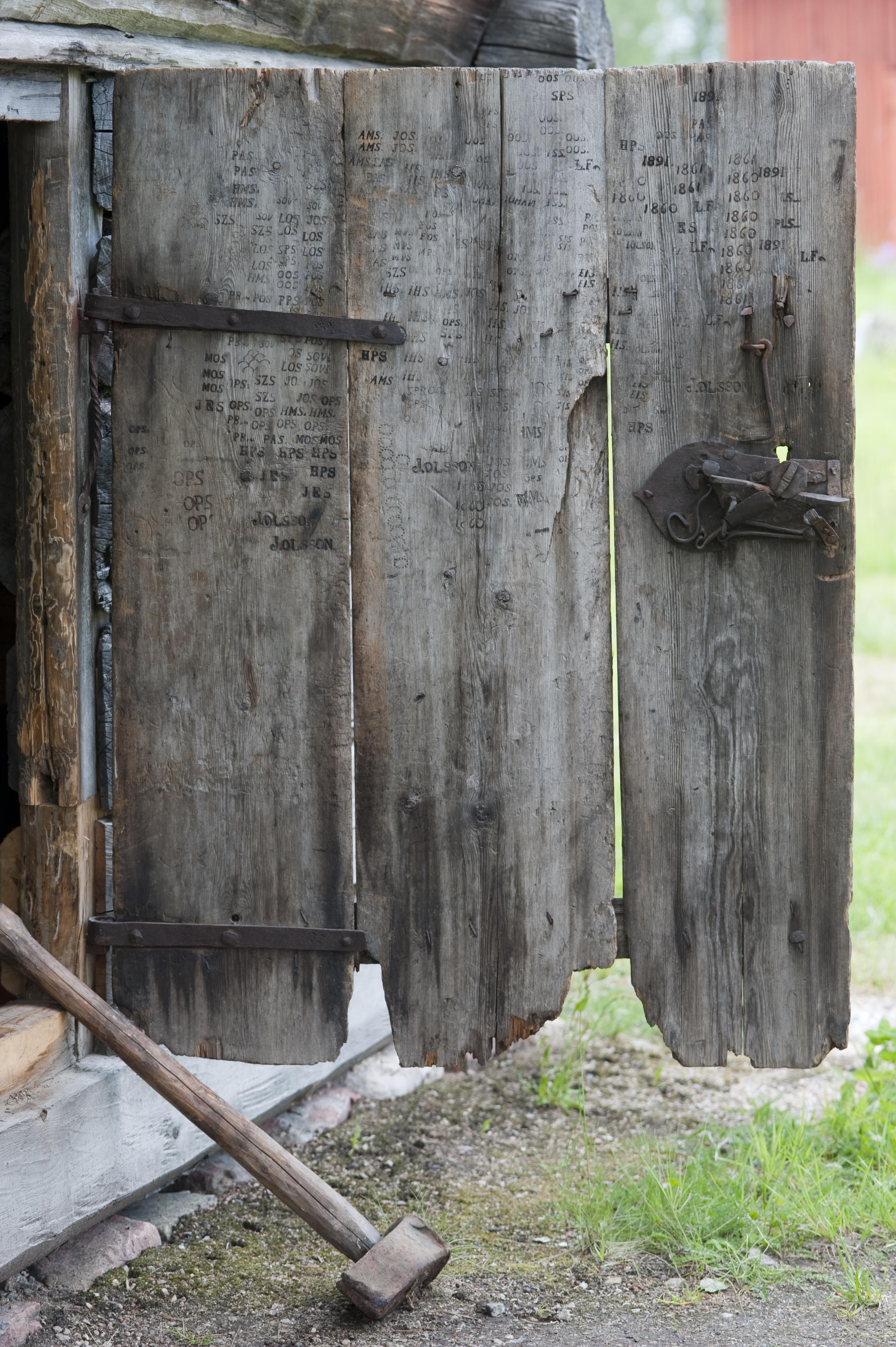 Ljusdal Fågelsjö 1:1. Dörr till smedja från 1785. Djupt inne i Orsa finnmark, i gränslandet mellan Hälsingland, Dalarna och Härjedalen, ligger Fågelsjö gammelgård, eller ?Bortom åa?, som den kallas i bygden. Här erbjuds en mycket god inblick i det liv som levdes på gården under 1800-talet. Hälsingegårdar. Fotosyfte: Dokumentation
