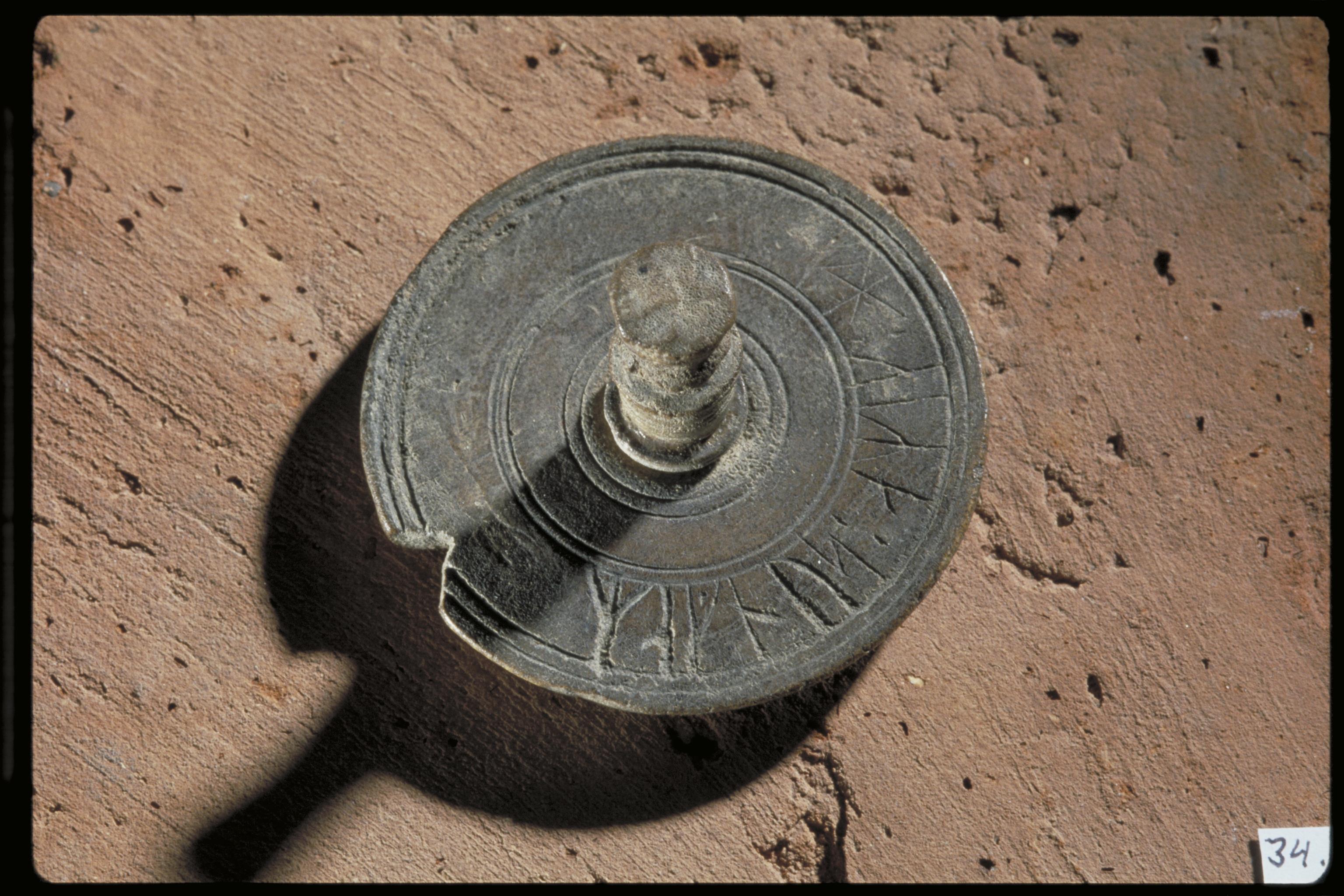 Lock av älghorn funnet vid grävning i Varnhems kloster 1925 i en del av klostret som bebotts av lekbröder. Inskriften lyder: Magnus äger mig .. Fotosyfte: Publicering/interaktiv media