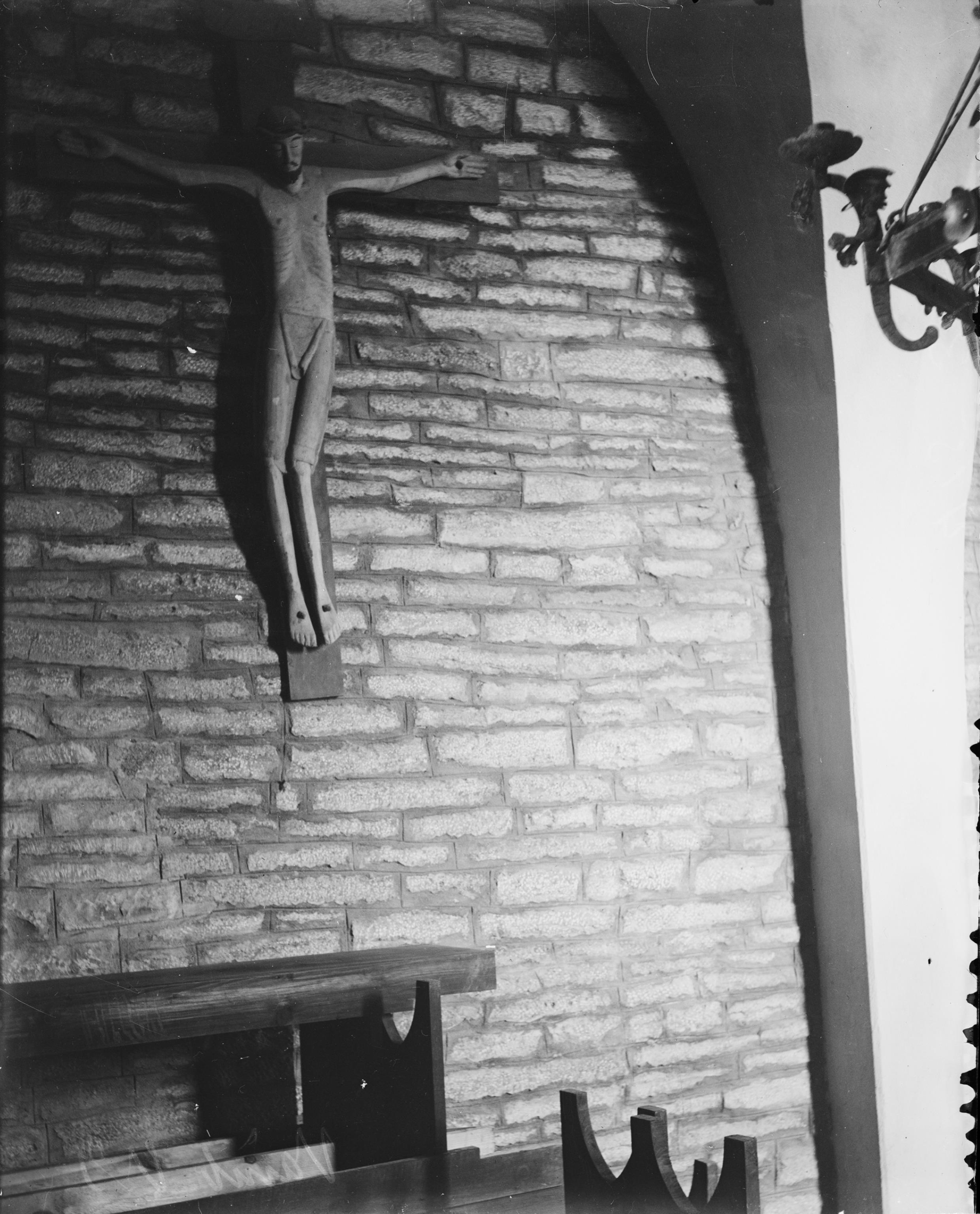 • Krucifix, träskulptur. Bestruken med tunn, vit färg utom i hår, skägg och krona. Korset yngre, omålat. Omkring 1200. Snabbinv.