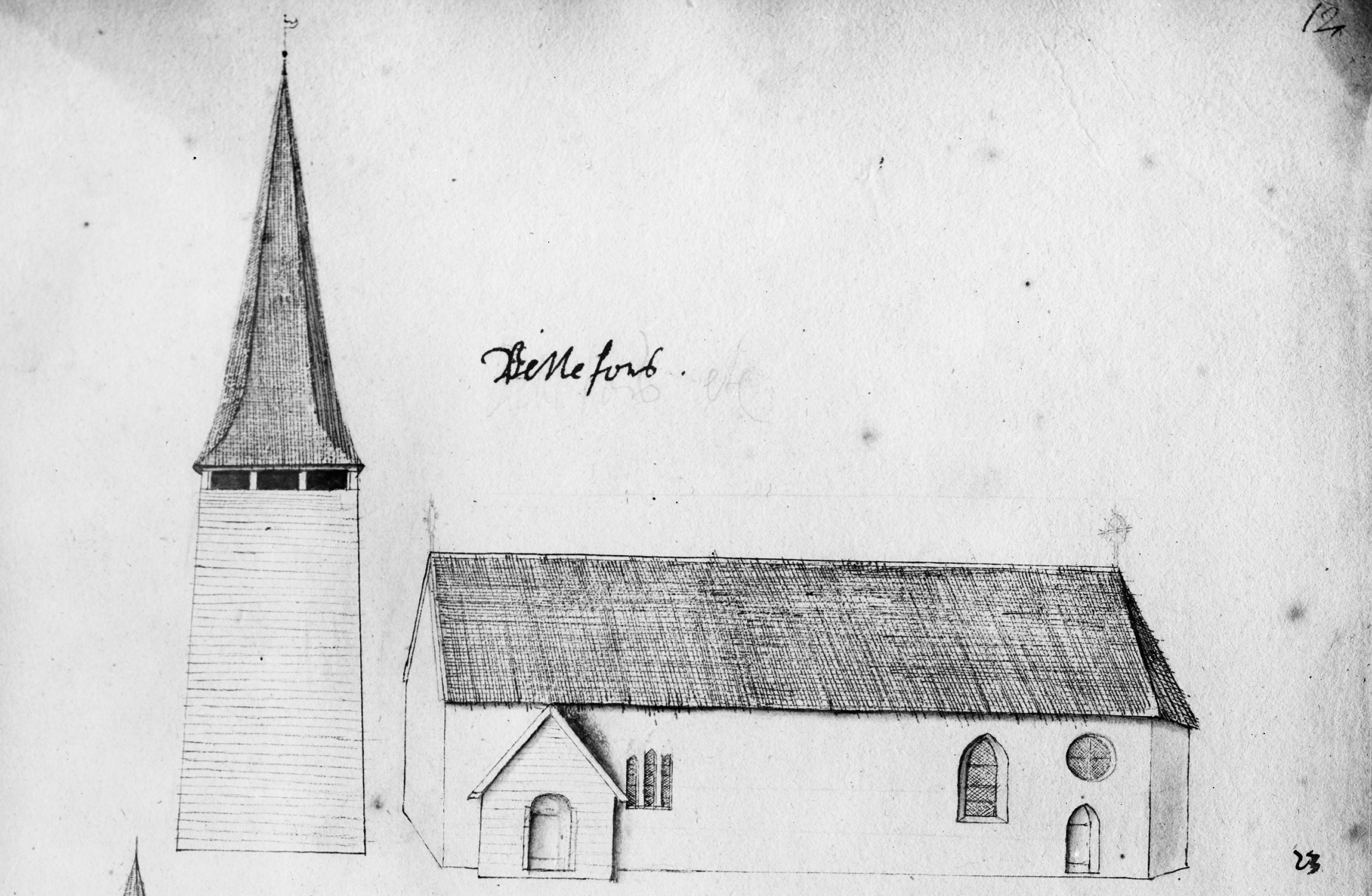 • Kyrkan och klockstapeln från söder. Foto efter teckning ur Peringskiölds monumenta.