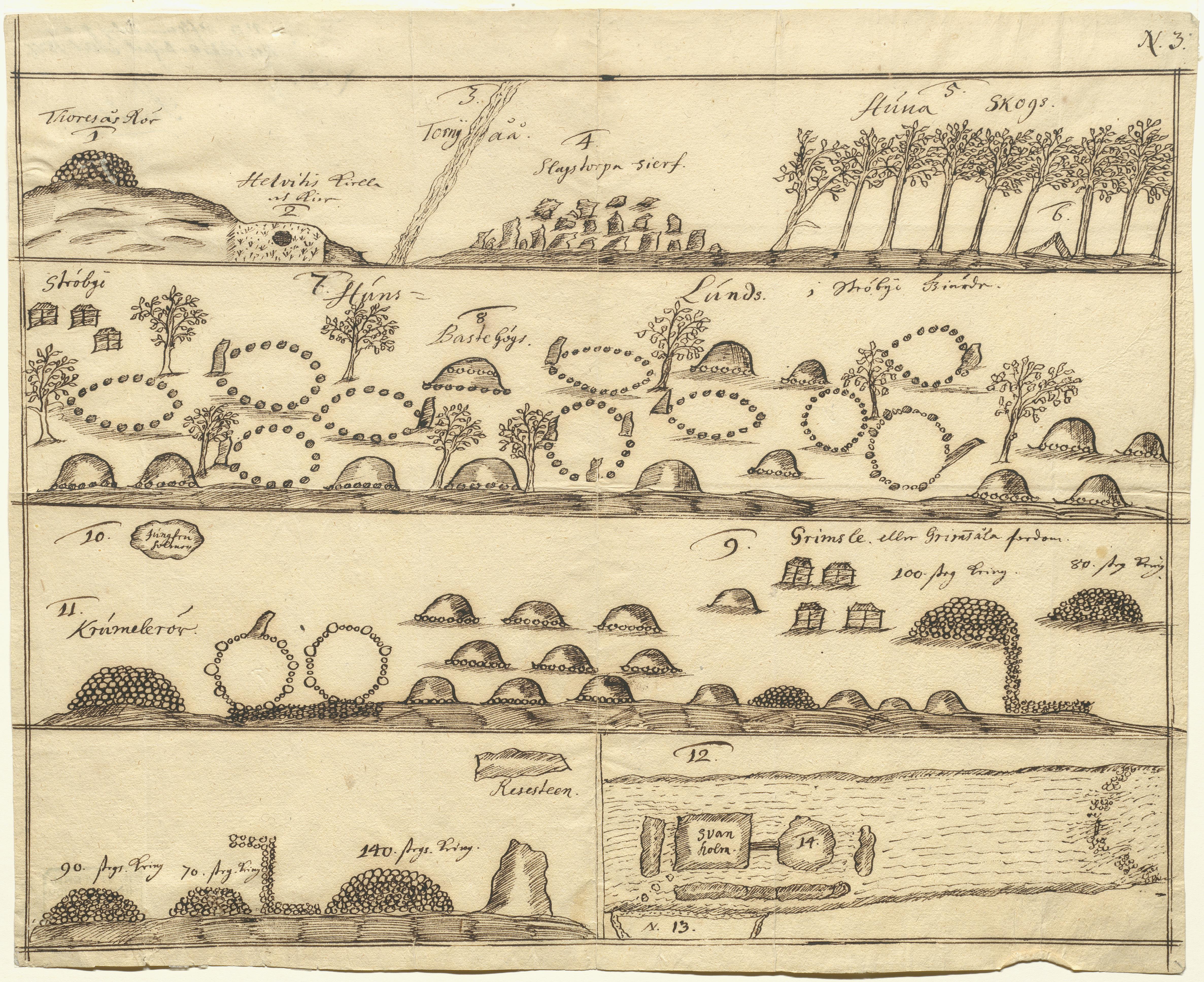 • Raä-nr: Skatelöv 111:1, 112:1, 113:1 m.fl. Omfattande fornlämningsområde efter Skatelövfjordens västra sida, som domineras av olika slags gravanläggningar samt en runsten (Sm 7). Tuschteckning trolige... Visa hela