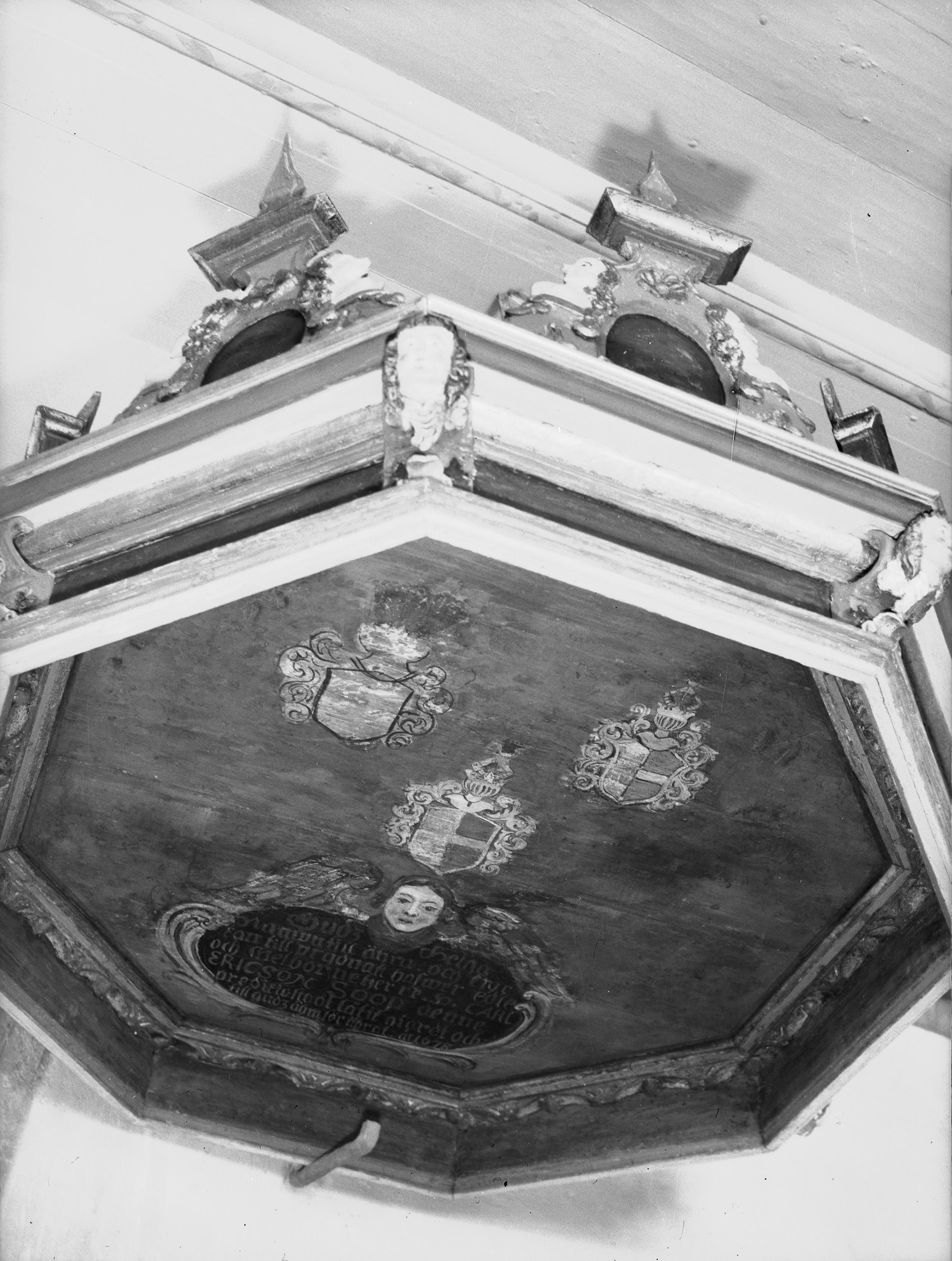 • Predikstolsbaldakin, av snidat och polykromerat trä, 1700-talet (Snabbinv.). Efter färgrenoveringen 1958.