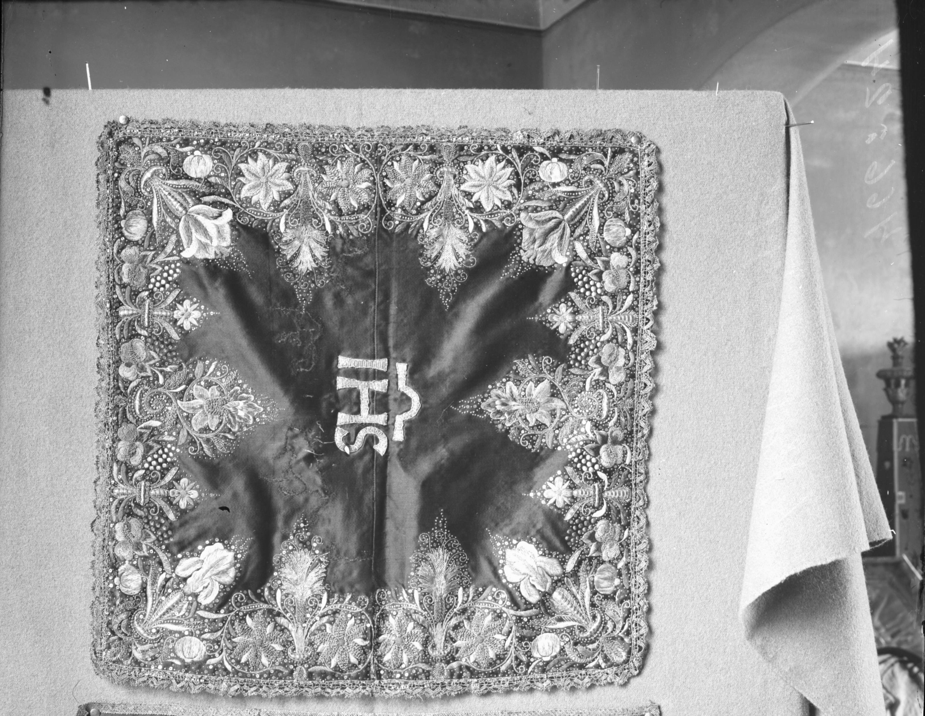 • Kalkduk, röd atlas, broderi i guld och silke, 1600-talets mitt.