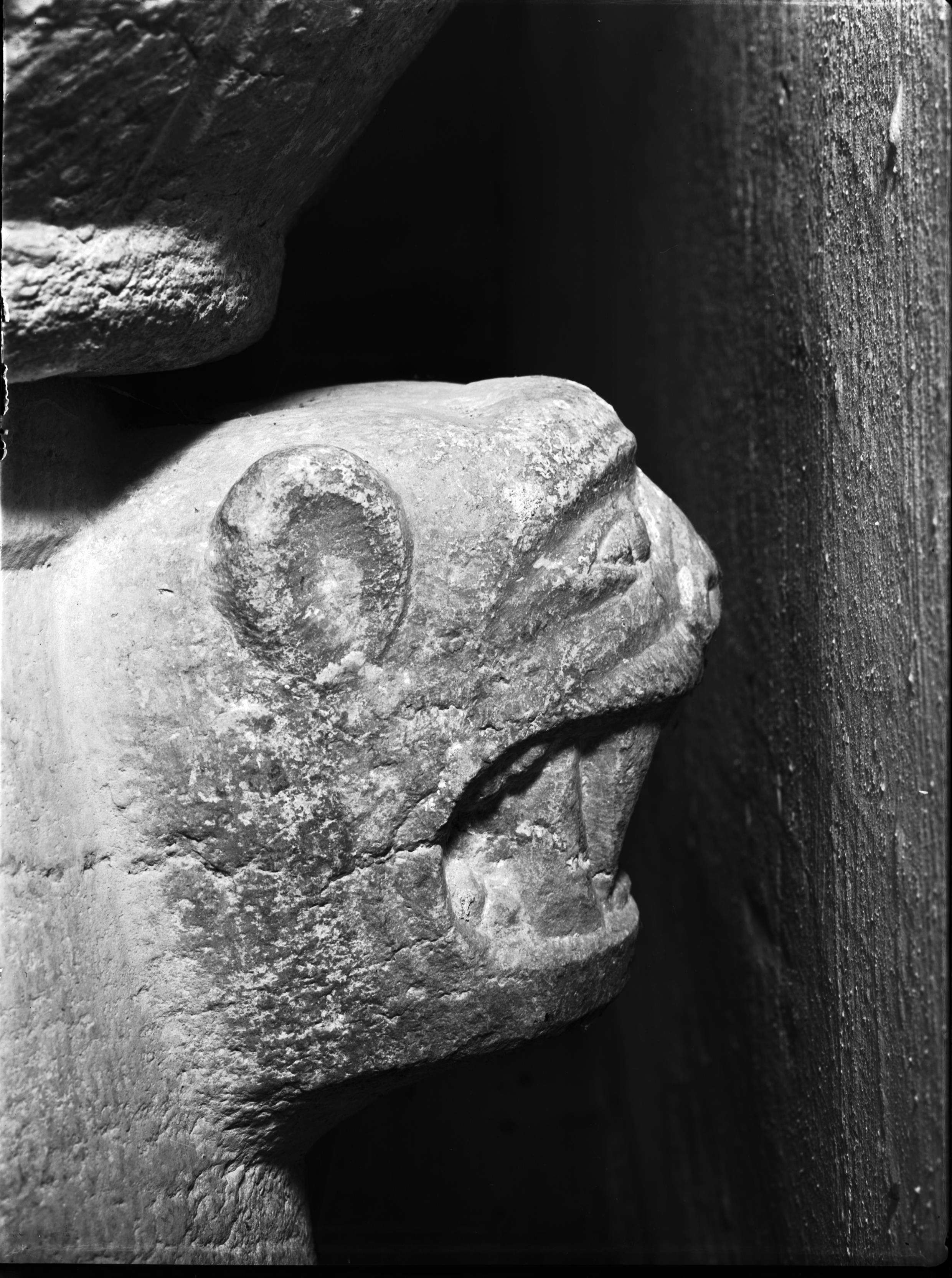 • Lejonhuvud på dopfuntens fot. Detalj.