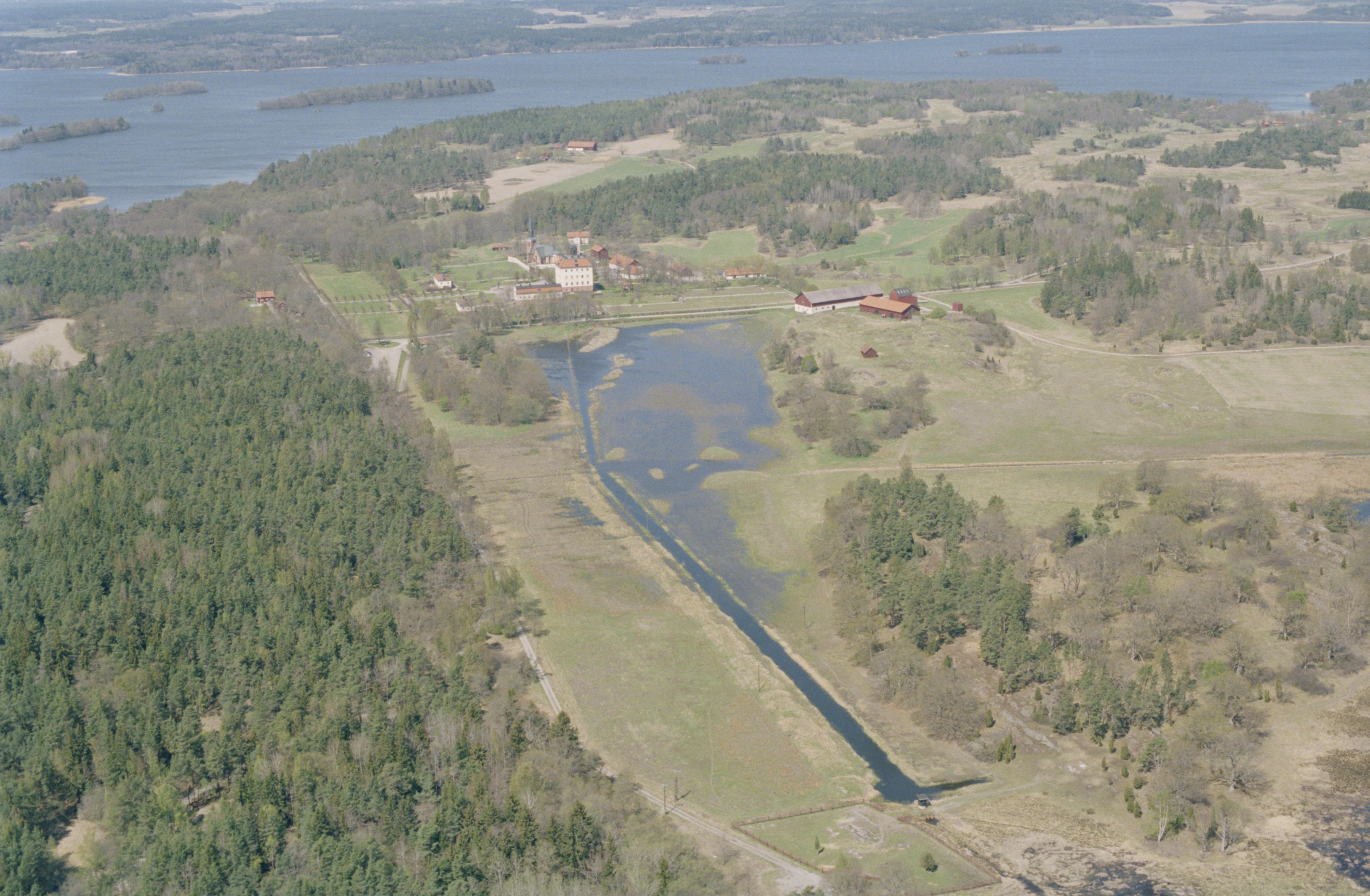 Ängsön och Ängsö naturrreservat vid Granfjärden i Mälaren. Över bildens mitt Ängsö kyrka och byggnadsminnet Ängsö slott i slottstomt RAÄnr Ängsö 4:1. Bilden är tagen mot (väderstreck): NV Fotosyfte: Flygbildsdokumentation