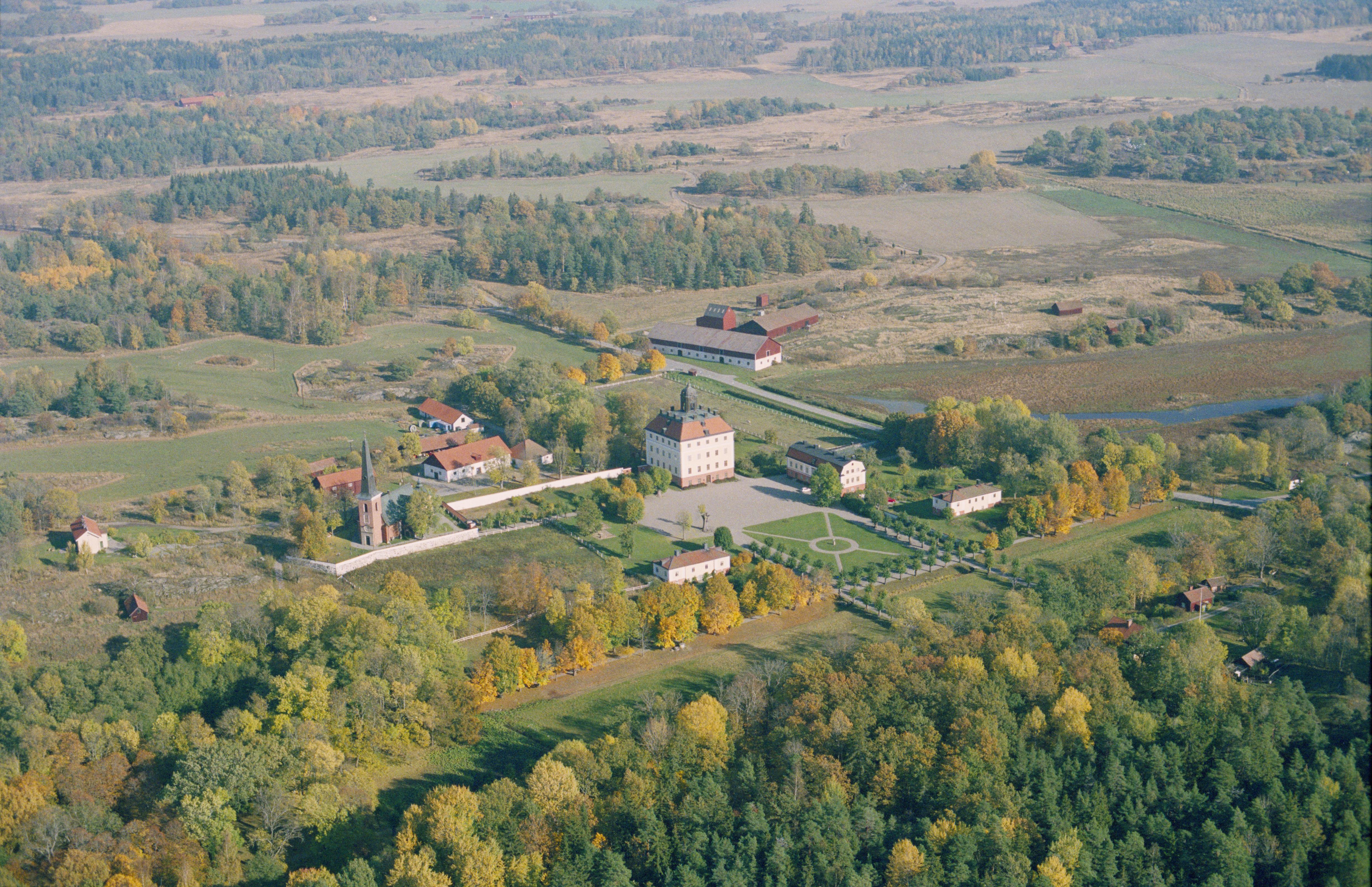 Ängsön och Ängsö naturrreservat vid Granfjärden i Mälaren. Ängsö kyrka till vänster. Vid bildens mitt byggnadsminnet Ängsö slott i slottstomt RAÄnr Ängsö 4:1. Bilden är tagen mot (väderstreck): ONO Fotosyfte: Flygbildsdokumentation