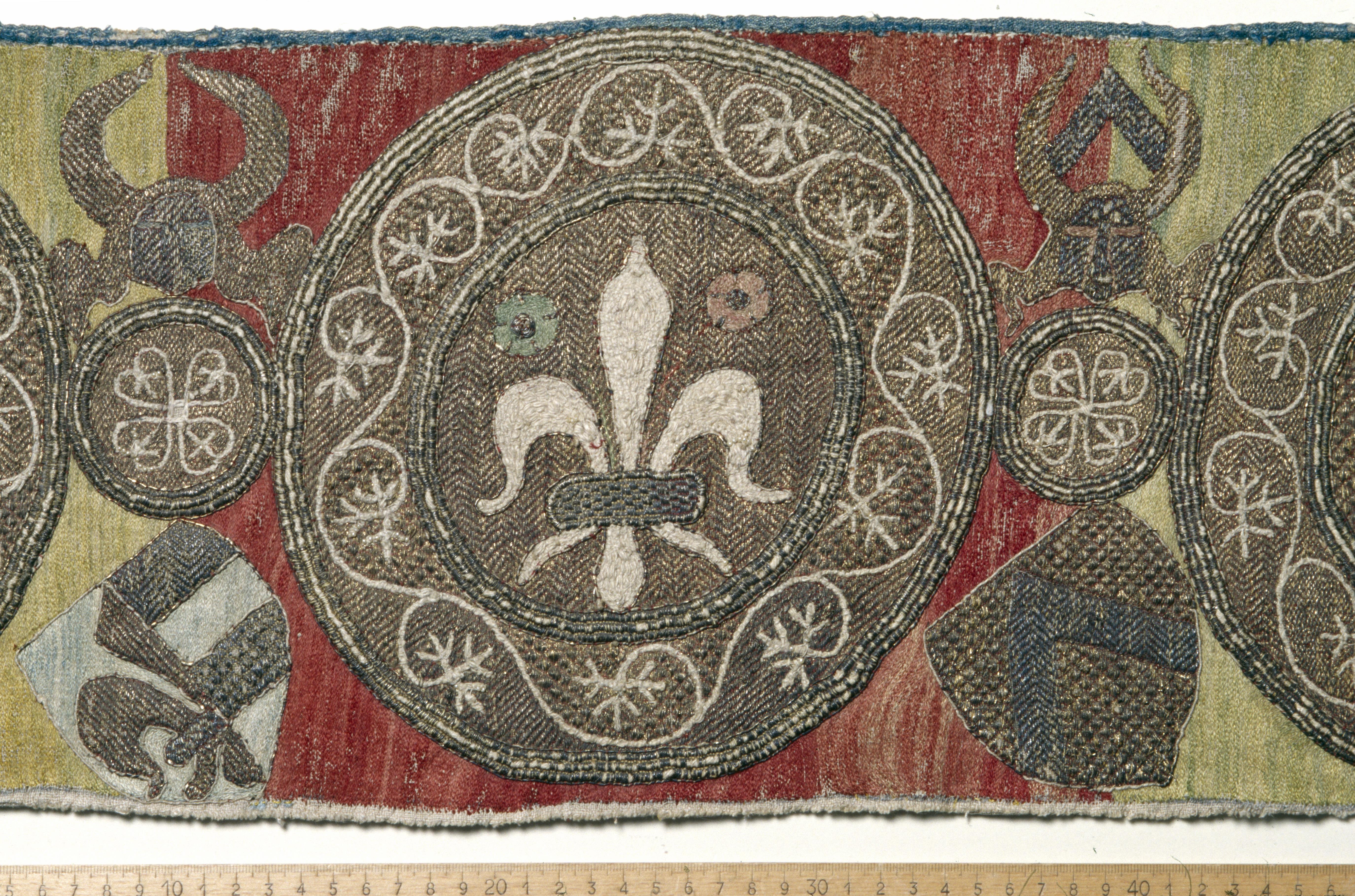 • Detalj av altarbrun, rundel med pärlbroderad lilja och vinkrans, endast enstaka pärlor bevarade. Utfört i Vadstena kloster omkring 1400.