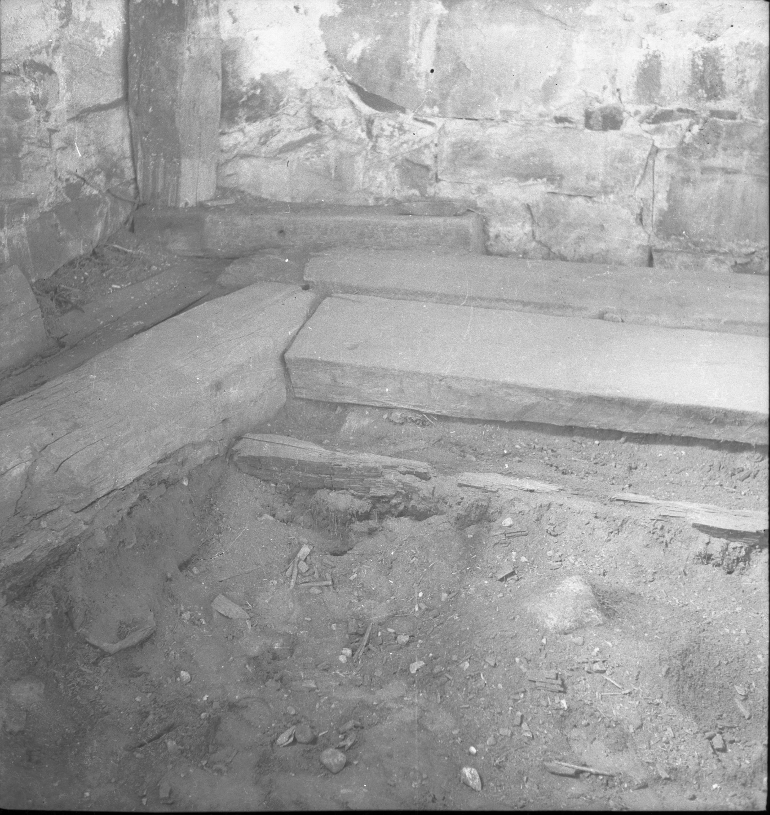 • Sydvästra hörnet av långhuset med syllstockar och golvplankor.