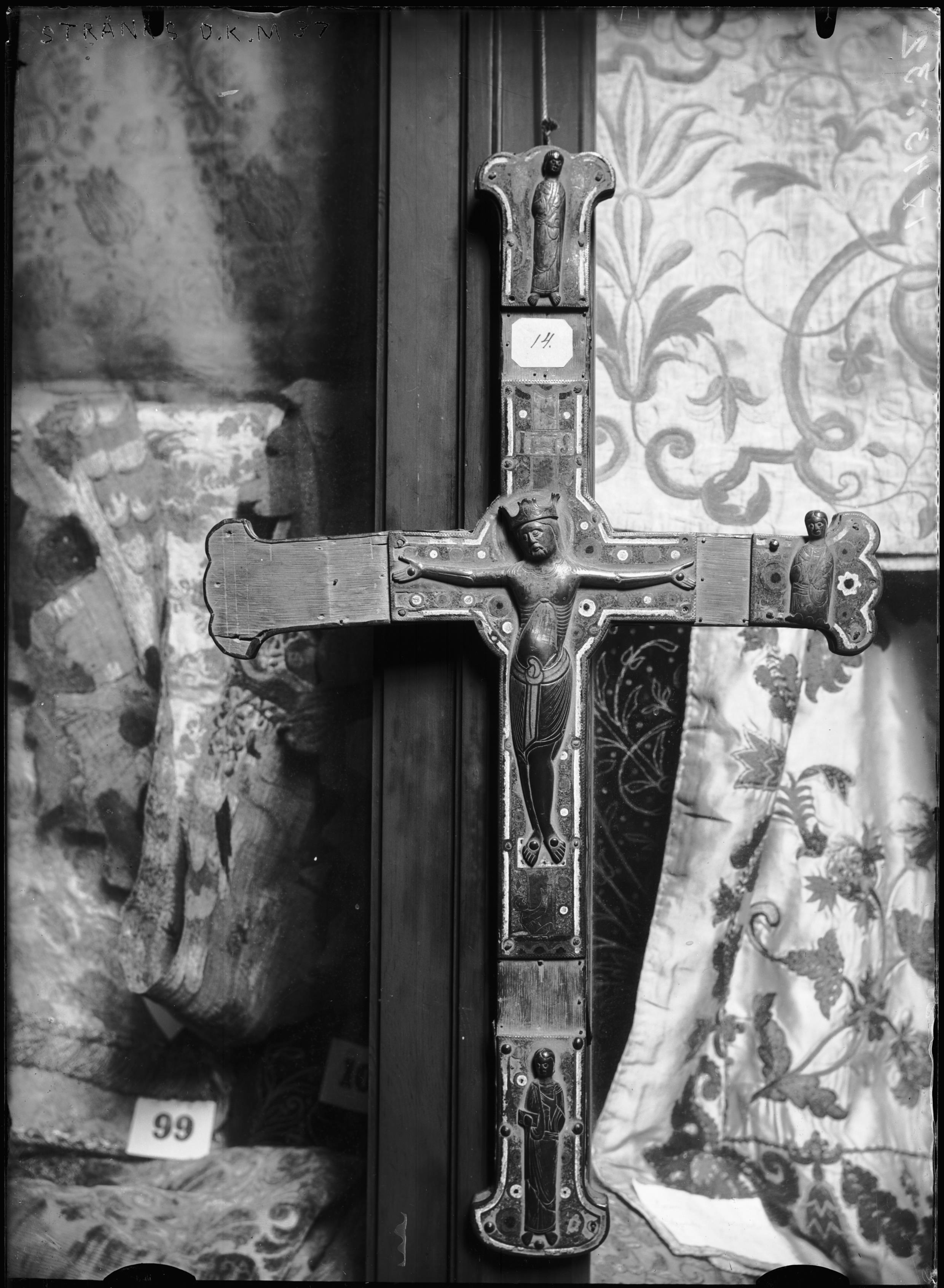 • Krucifix, trästomme, beslagen med kopparplattor, Limoges, från omkring 1200, framsida.