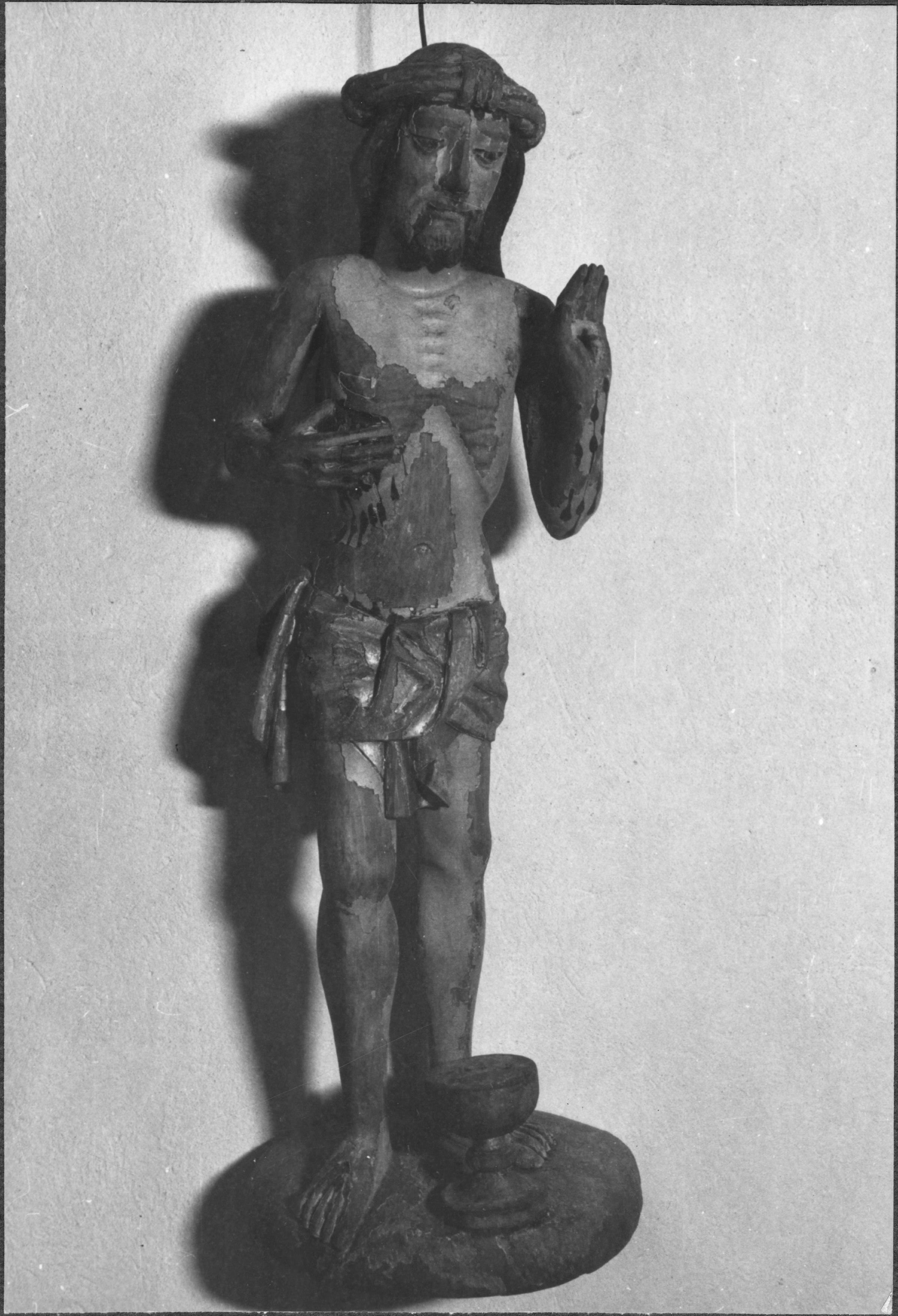 • Träskulptur föreställande Kristus, med kalken vid fötterna. !400-talets senare hälft. Före restaurering.