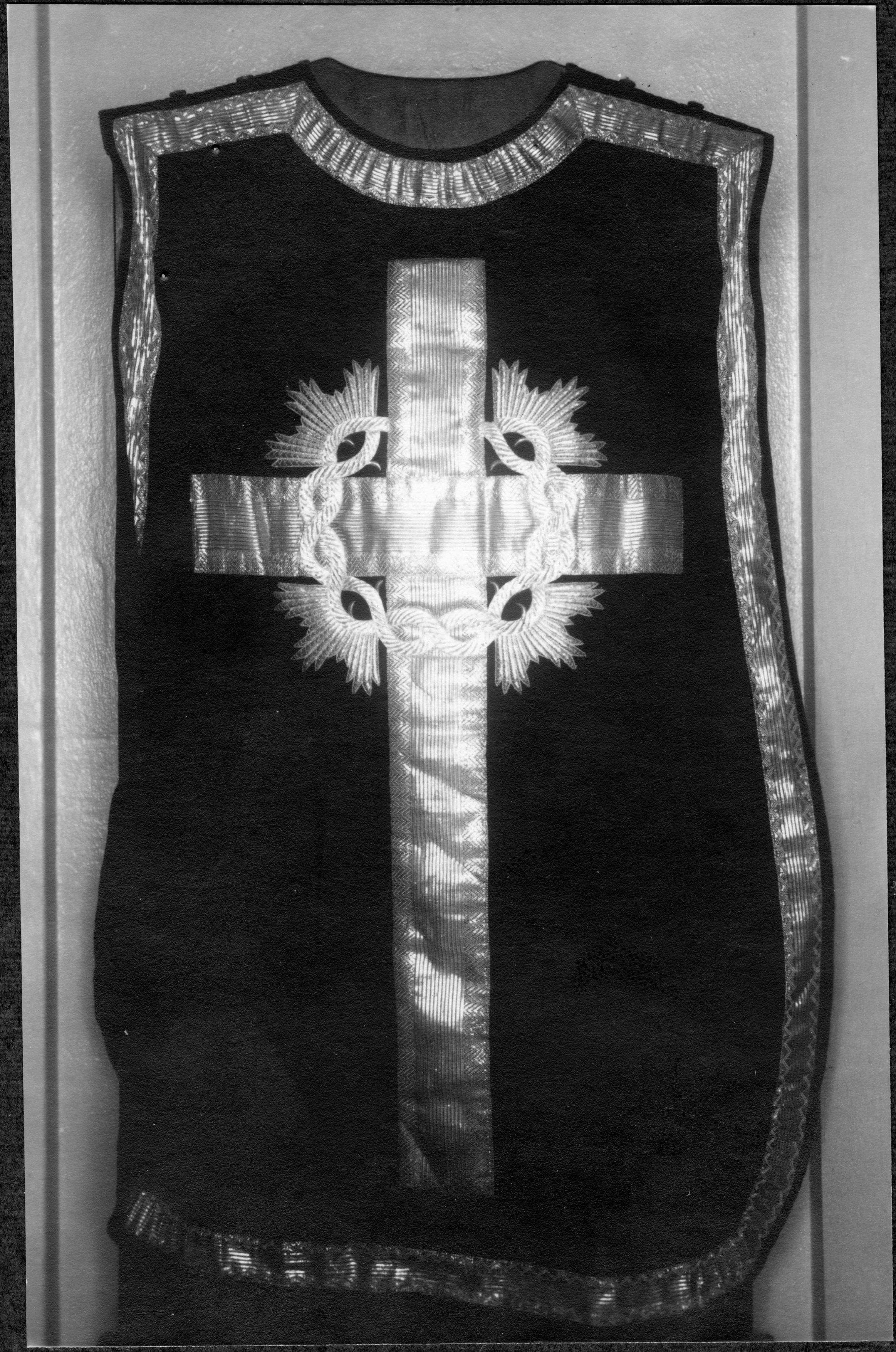 • Mässhake, svart sammet, silvergaloner, baksida med kors och törnekrona. Före renovering.
