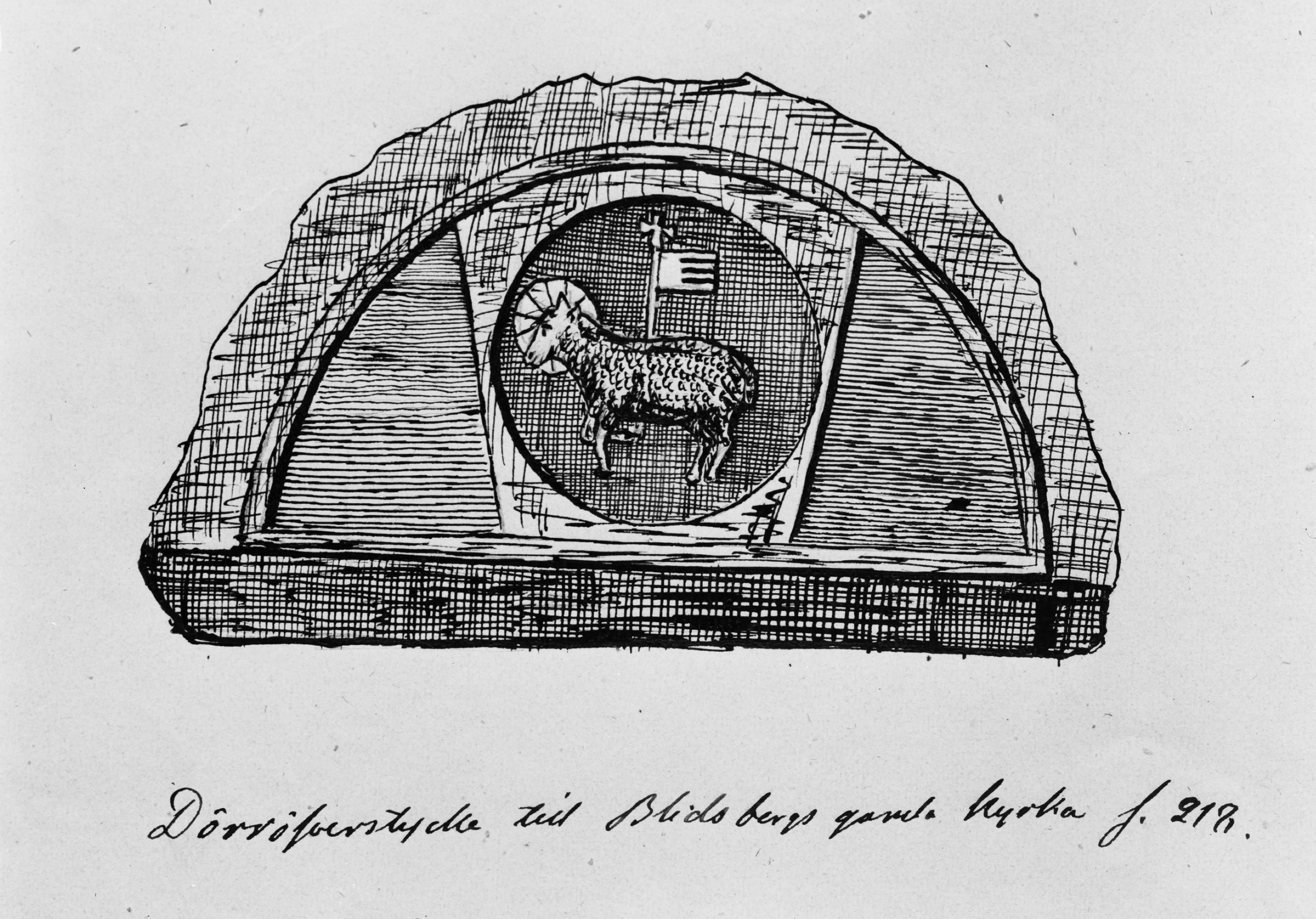 • Dörröverstycke, tympanon med lamm med segerfana. Foto efter teckning ur Djurklou: Elfsborgs län I, 1868.