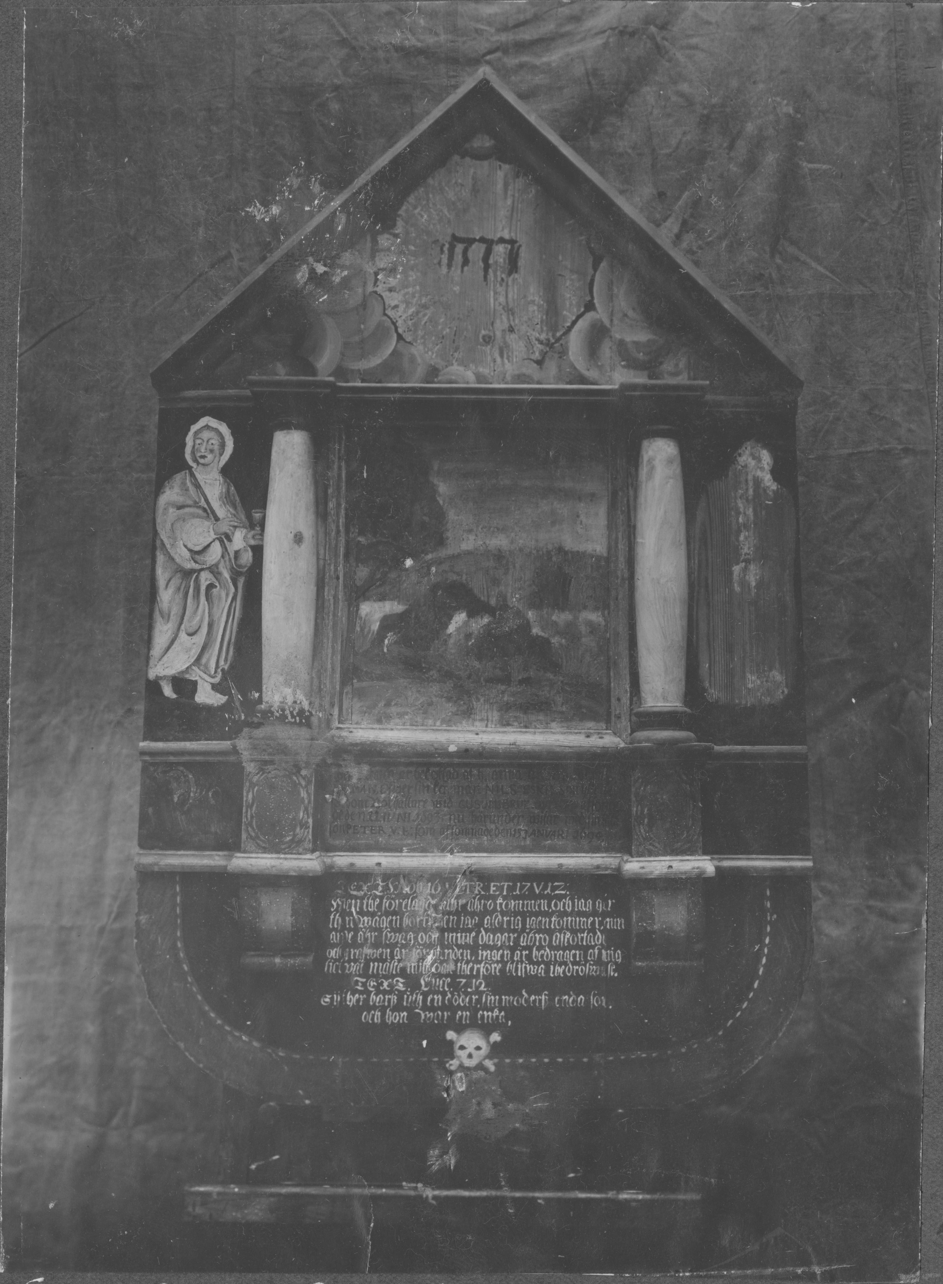 • Epitafium över kyrkvärd Andreas Hellman, död 1702. Trätavla med spetsgavelformig avslutning uppåt. Efter konservering 1938.