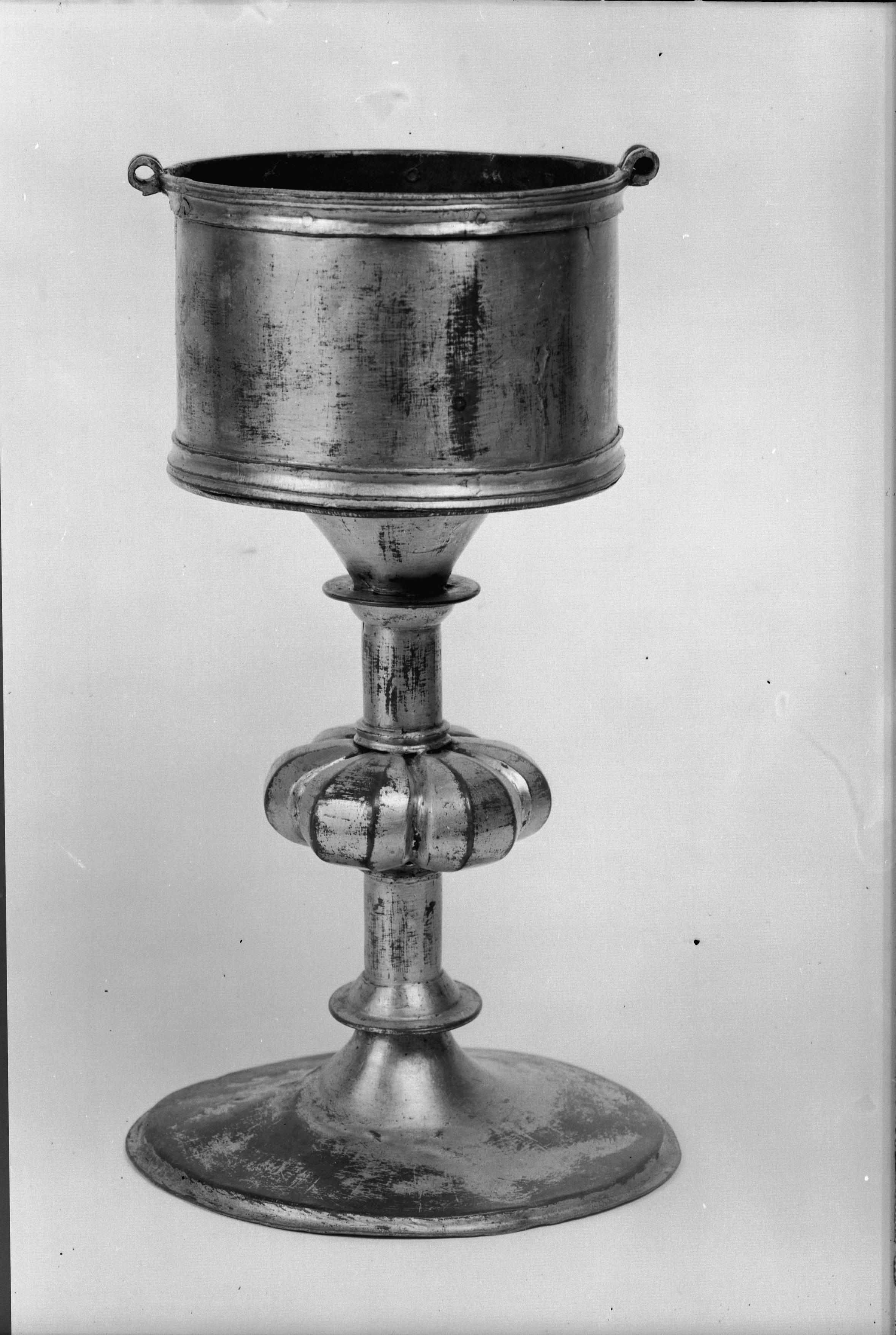 • Ciborium av förgylld koppar. Cylindrisk ask med två gångjärn till nu förkommet lock.