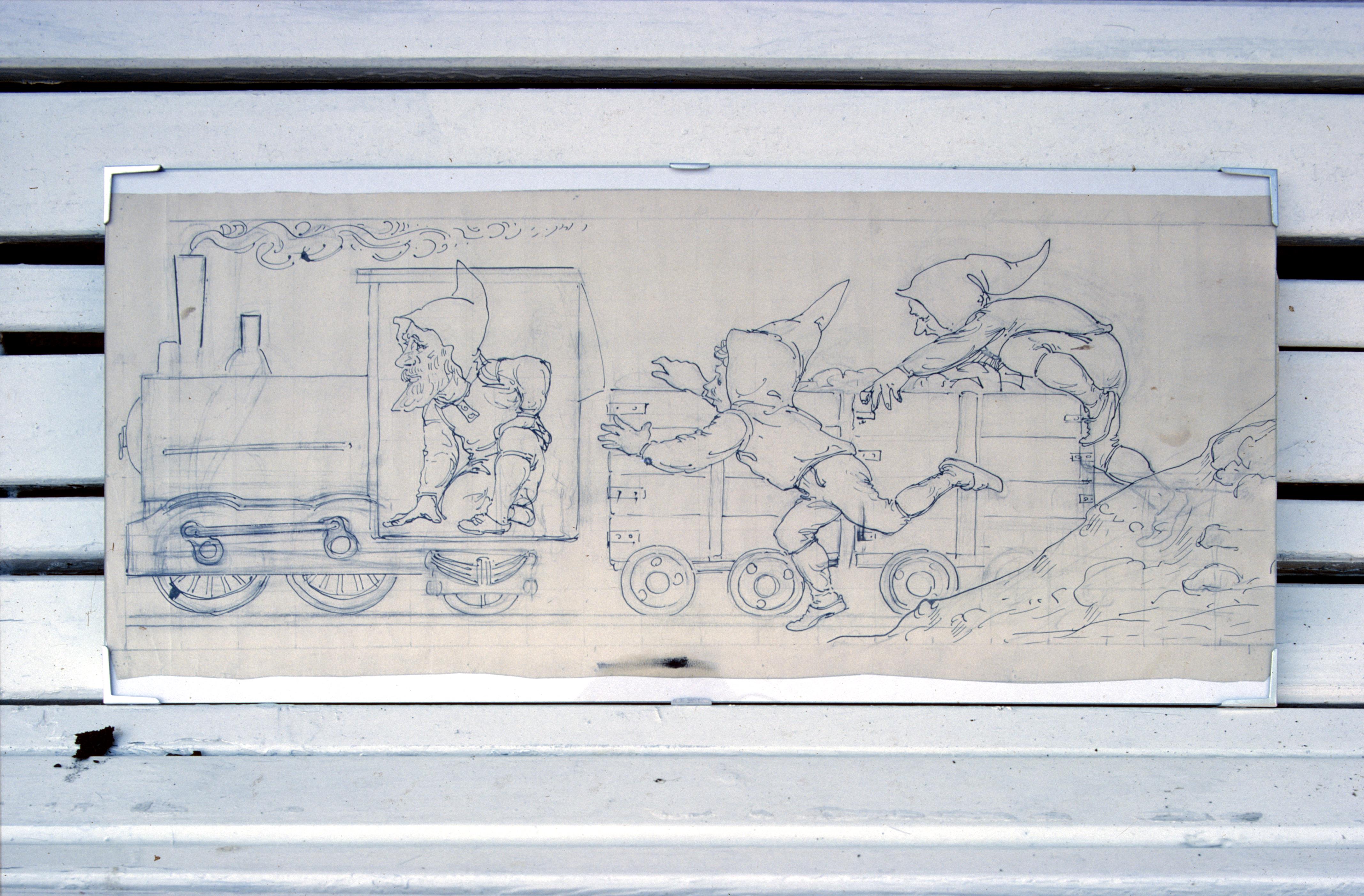 Takfris som illustrerar gruvverksamheten med små tomtar som gruvarbetare. Fotosyfte: Bildarkivet
