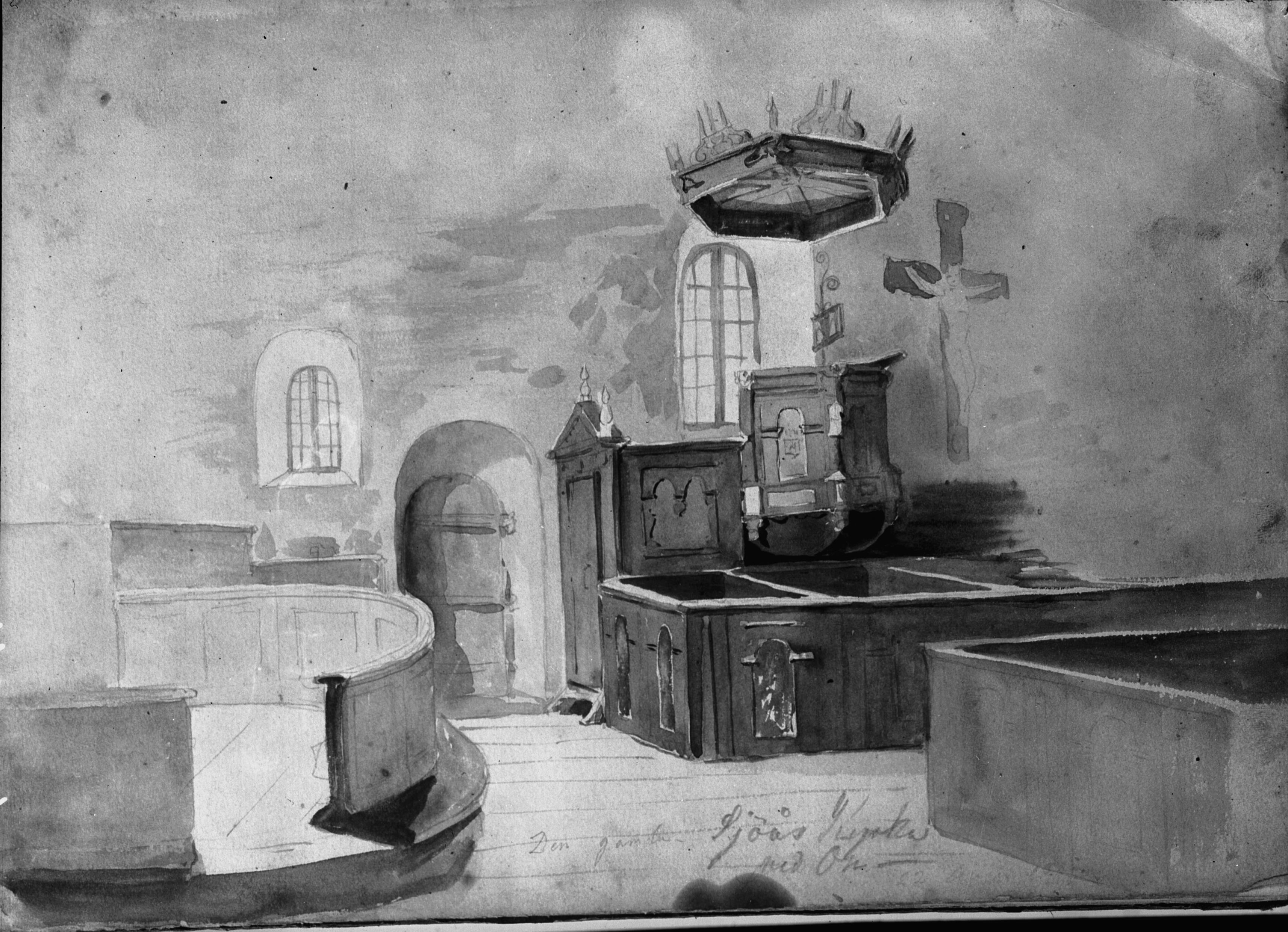 • Interiör, sydöstra partiet. Foto efter teckning ur Bengt Nordenbergs skissbok, Kulturhistoriska Museet, Lund.
