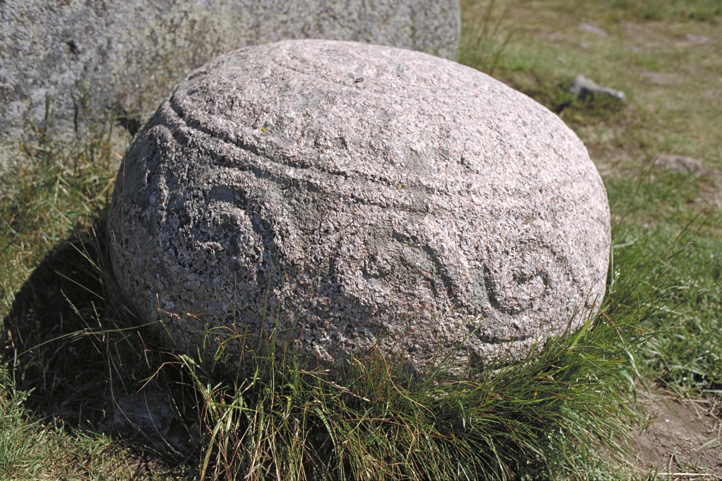 • Ornerat granitklot framför den resta hällen på Inglingehög.