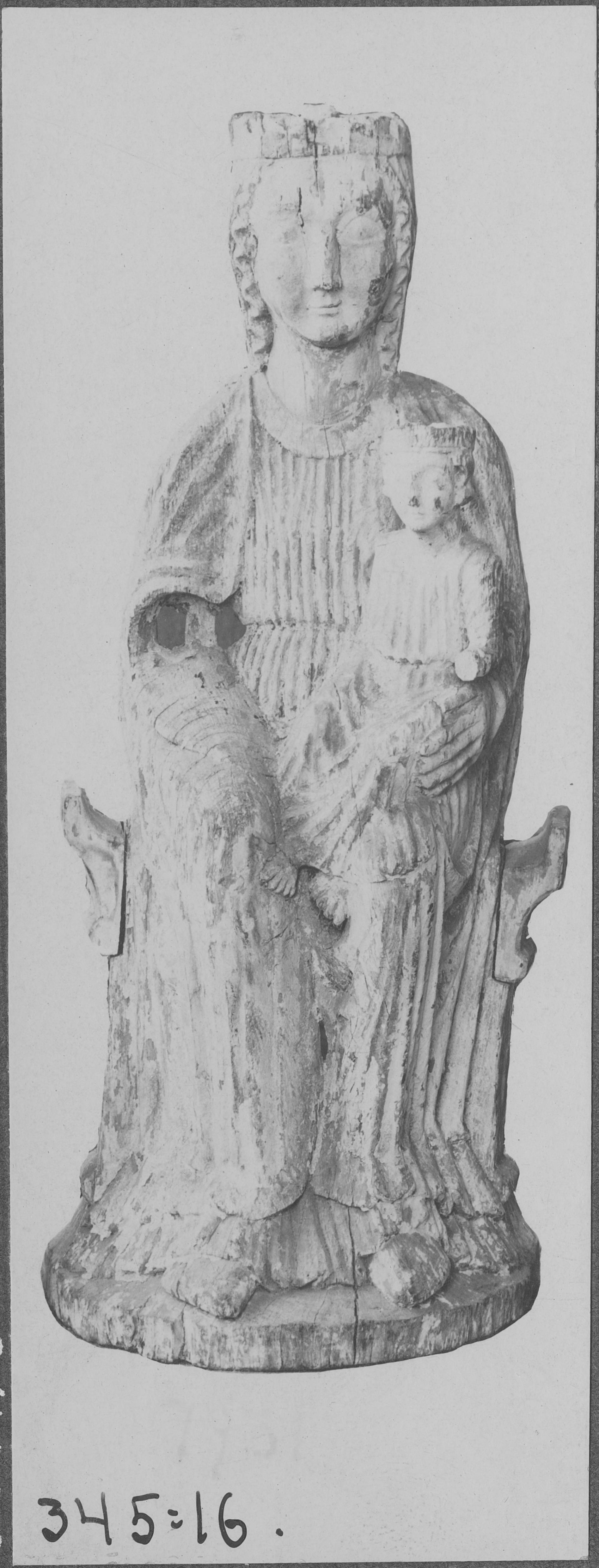 • Madonnaskulptur av trä, från 1200-talet. Från Norrköpingsutställningen 1906