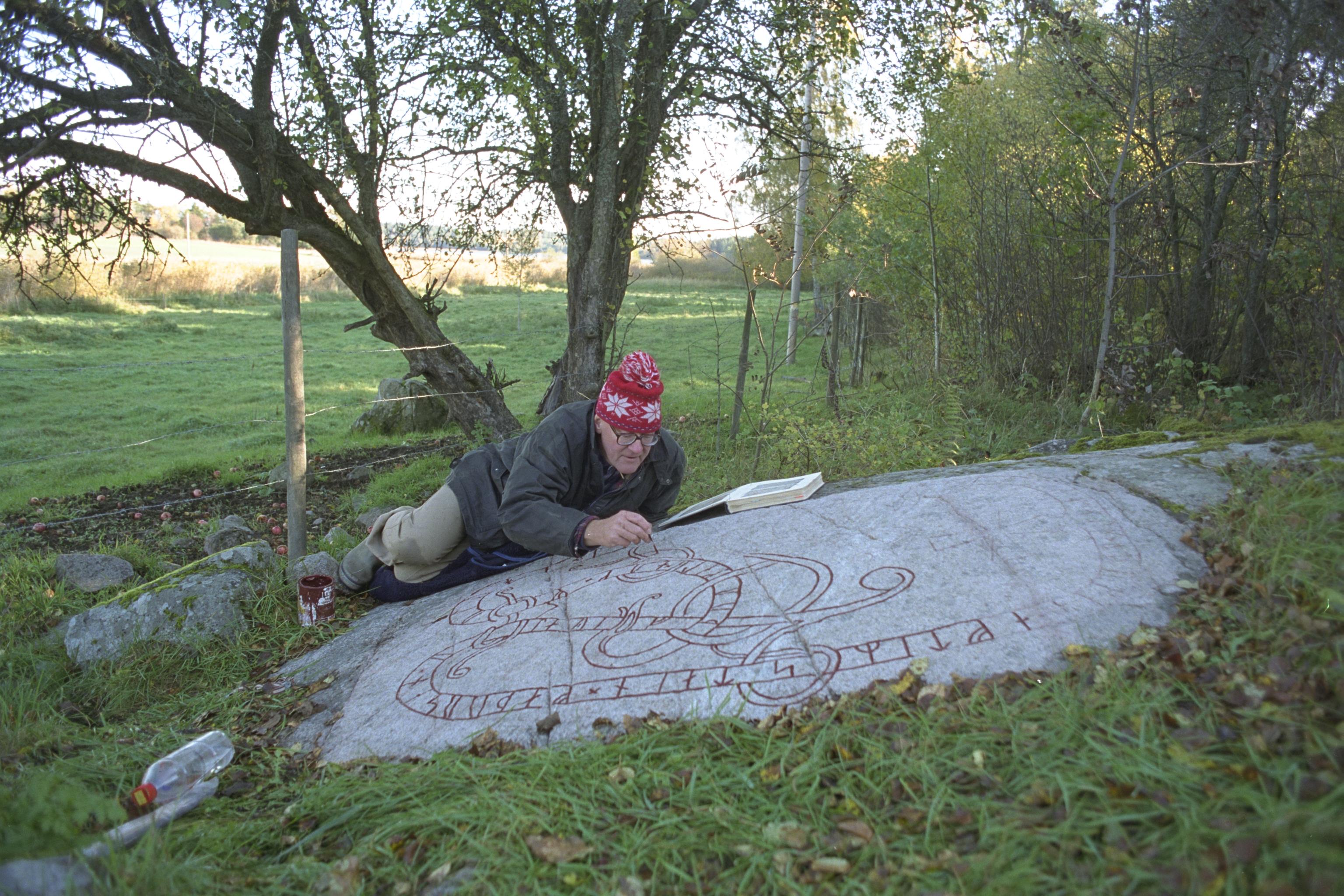 Fornlämning nr 46. Båda objekten är runhällar. Inskrift från 1000-talet e.Kr. Nyuppmålad. Helmer Gustavson.