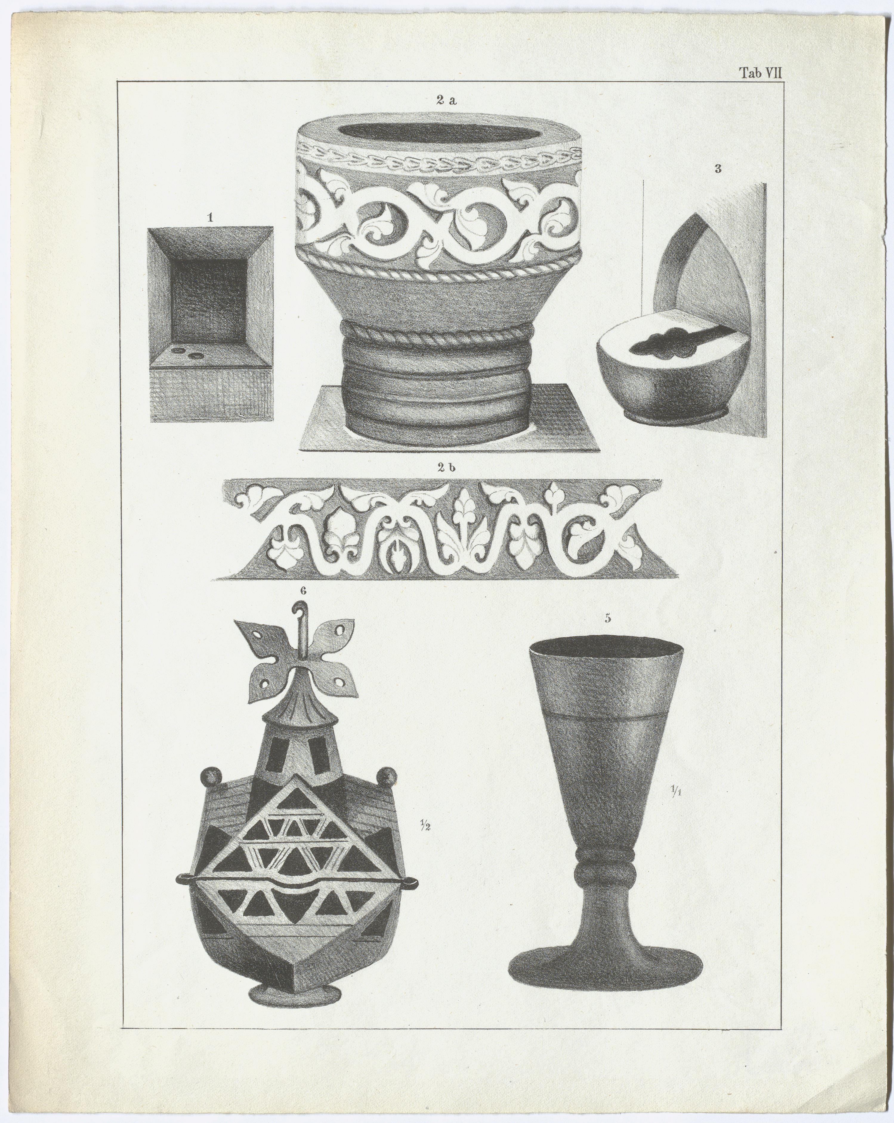 • Dopfunt, rökelsekar, kalk mm. Litografi efter teckning av Hilder Werner, troligen från 1870-talet (jfr hans verk "Warnhems kloster och kyrka" 1878,1881).