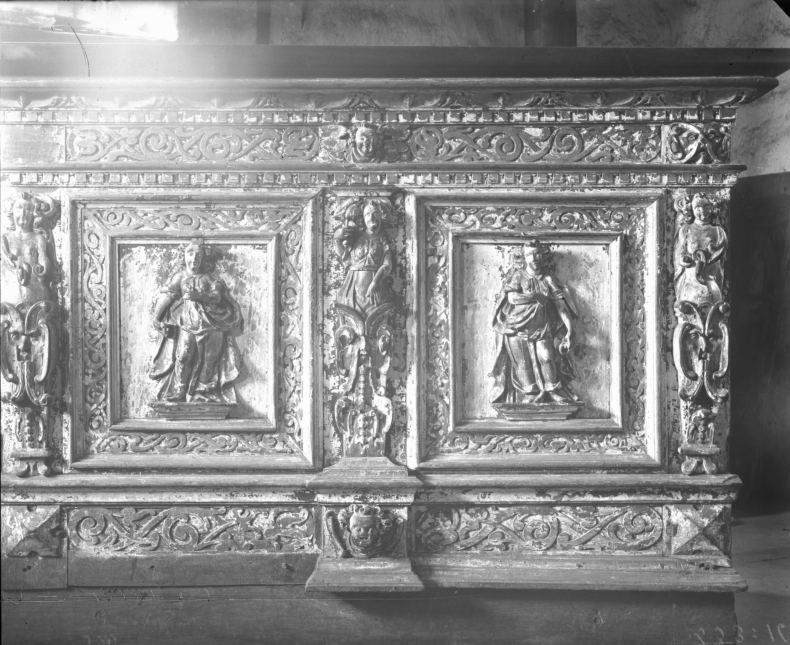 • Kista av trä, i sakristian, dekorerad med slingornamentik och figurframställningar.