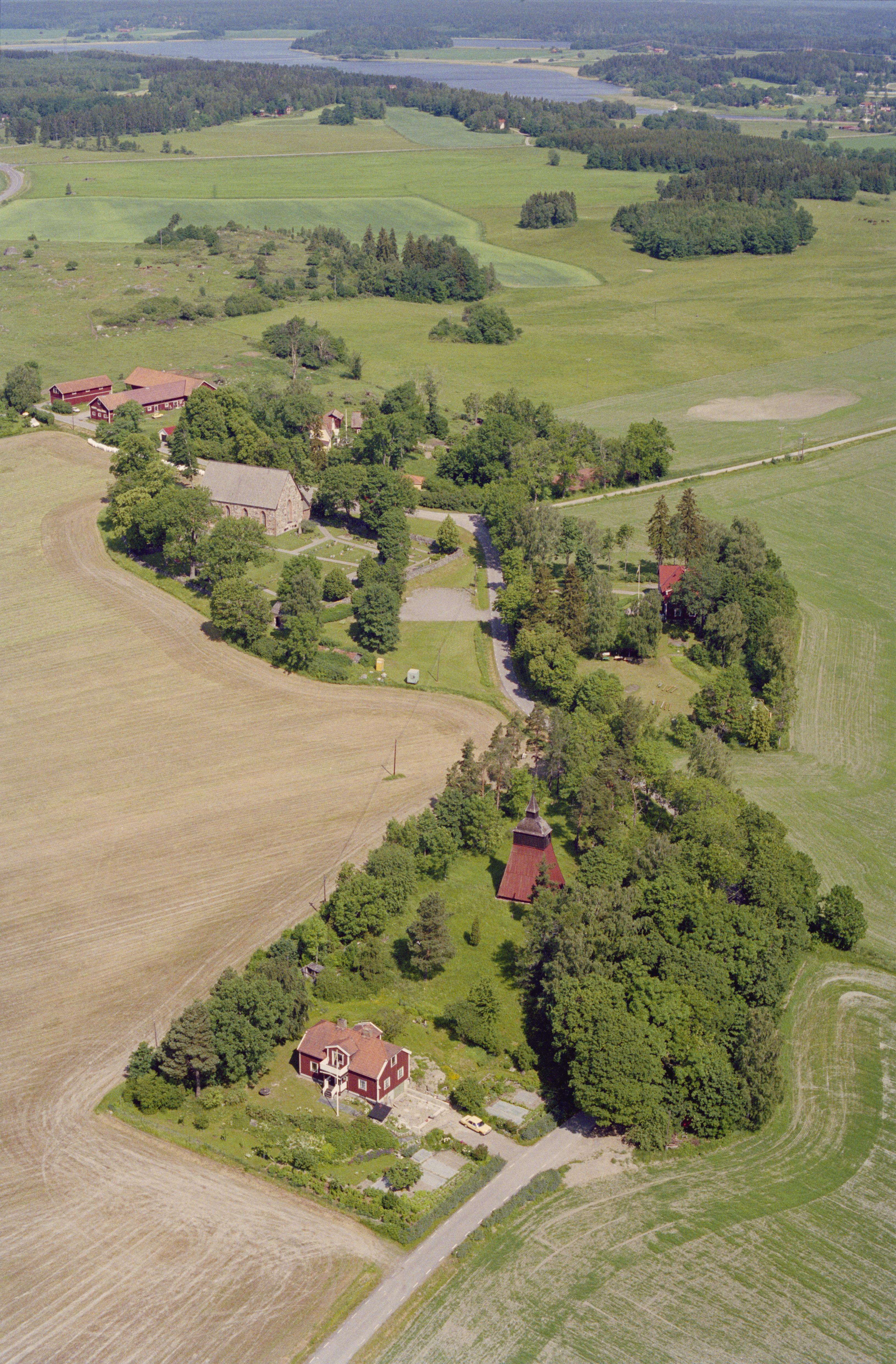 • Håtuna kyrka och kyrkby. Vid bildens mitt Prästgårdens gamla tomt RAÄnr Håtuna 157:1. I bildens övre del Håtunaviken i Mälaren mot socknet Sankt Per. Bilden är tagen mot (väderstreck): NV