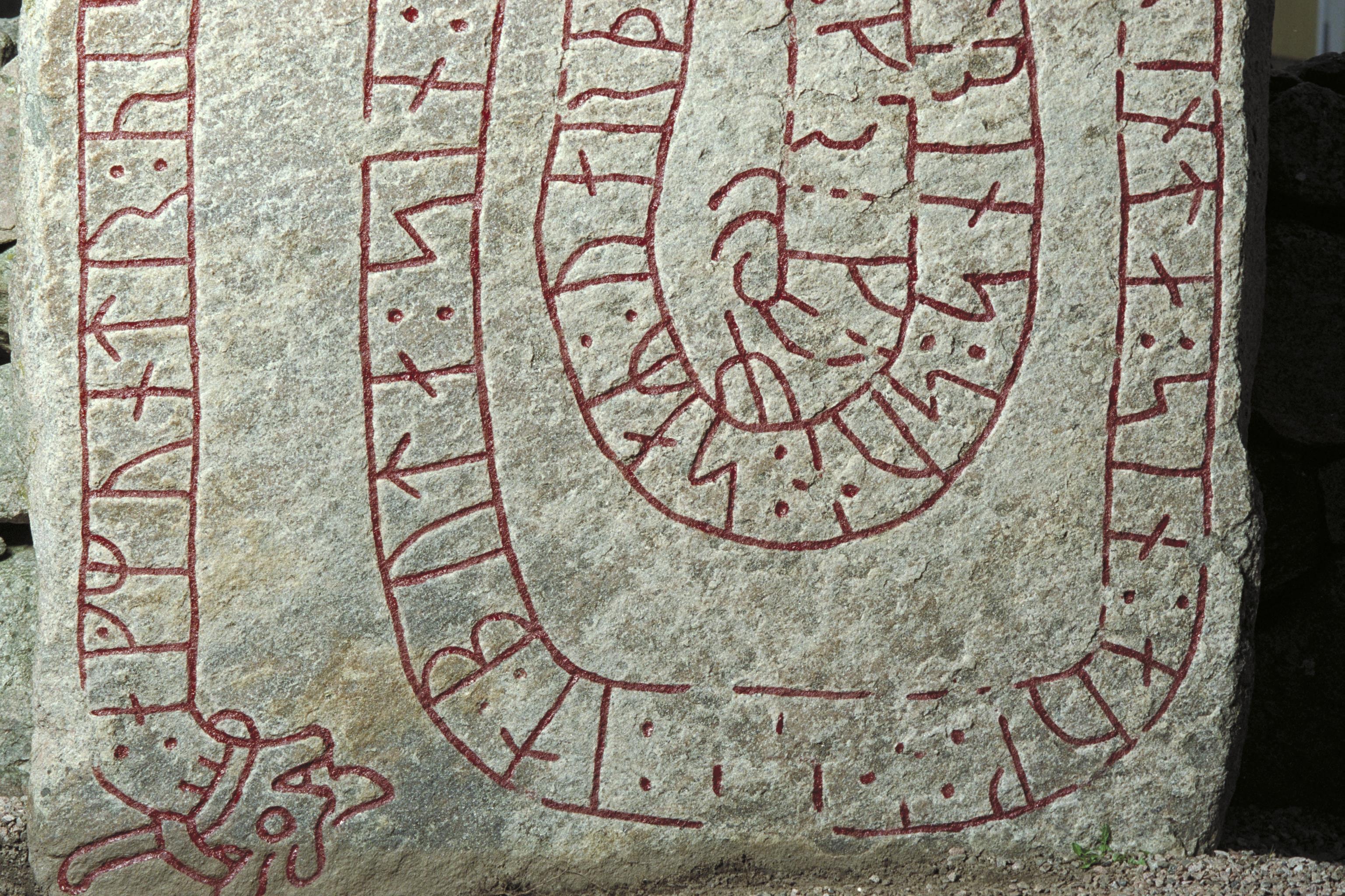 Nedre delen av runstenen Vg175. Inskriften lyder: Agmund reste denna sten efter Äsbjörn, sin fräde, och Åsa(?) efter sin make, och denne var son till Kolben. Han dog i Grekland. Fotosyfte: Publiceringsbild