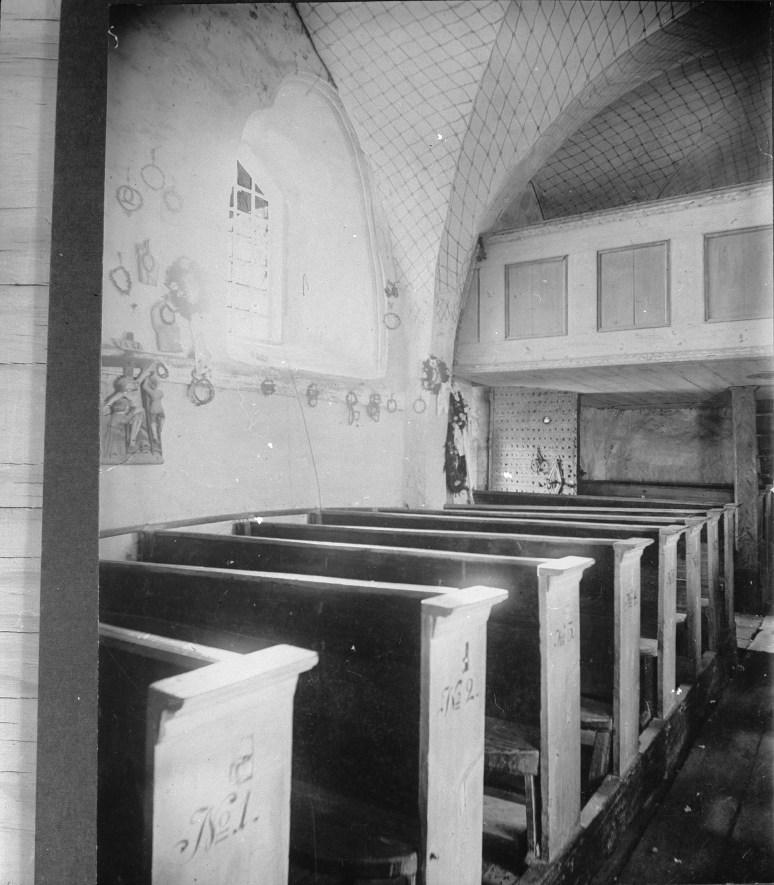 • Interiör med läktare och läktarbröstningar samt bänkgavlar.