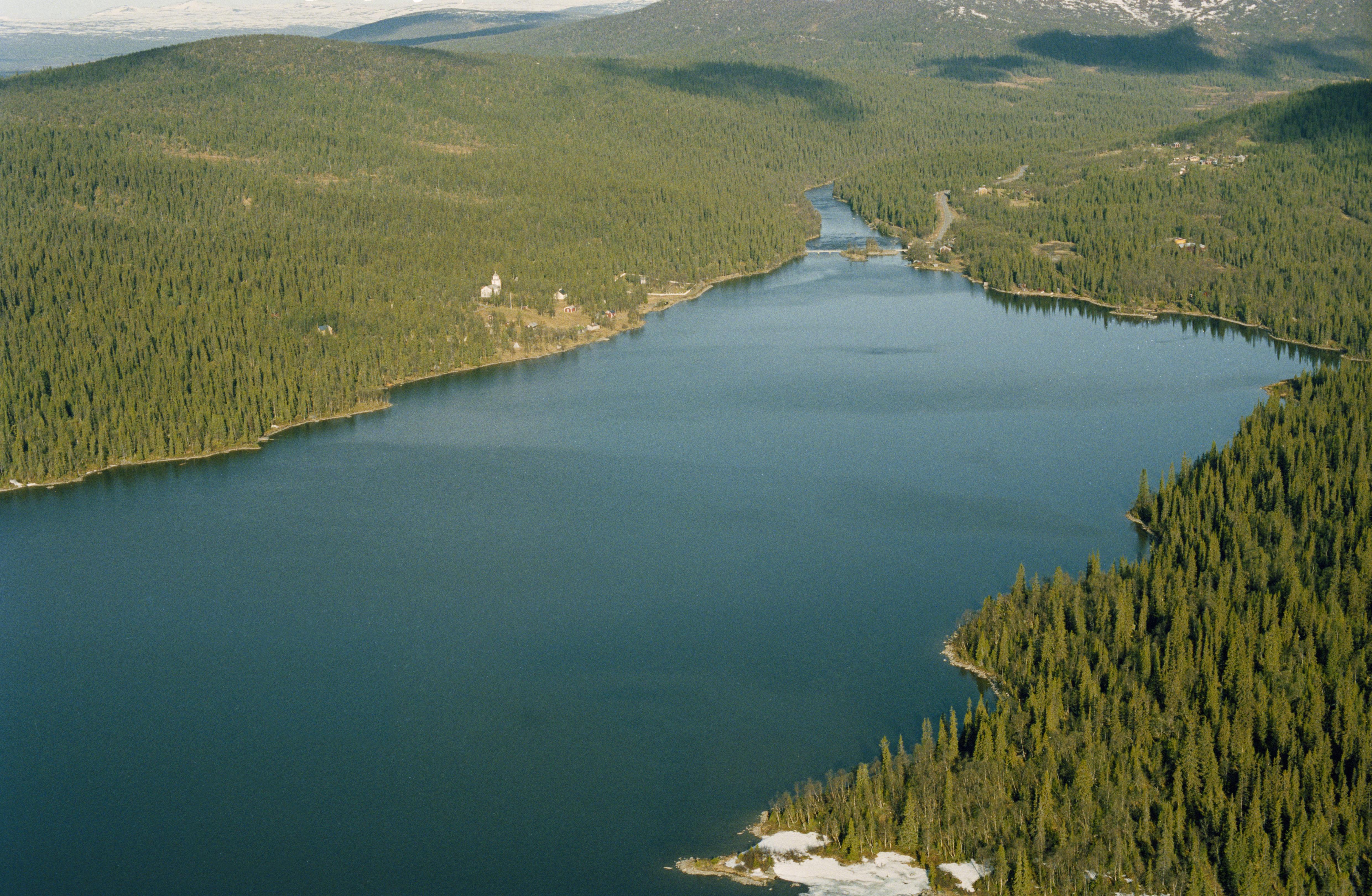 Fatmomakke (Faepmie) kulturreservat och kyrkstad vid Fatmomakkeviken i norra ändan av Kultsjön (Gåaltoe). Fatmomakke kapell och kyrkstad till vänster över bildens mitt. Vid kyrkstaden boplats RAÄnr Vi...