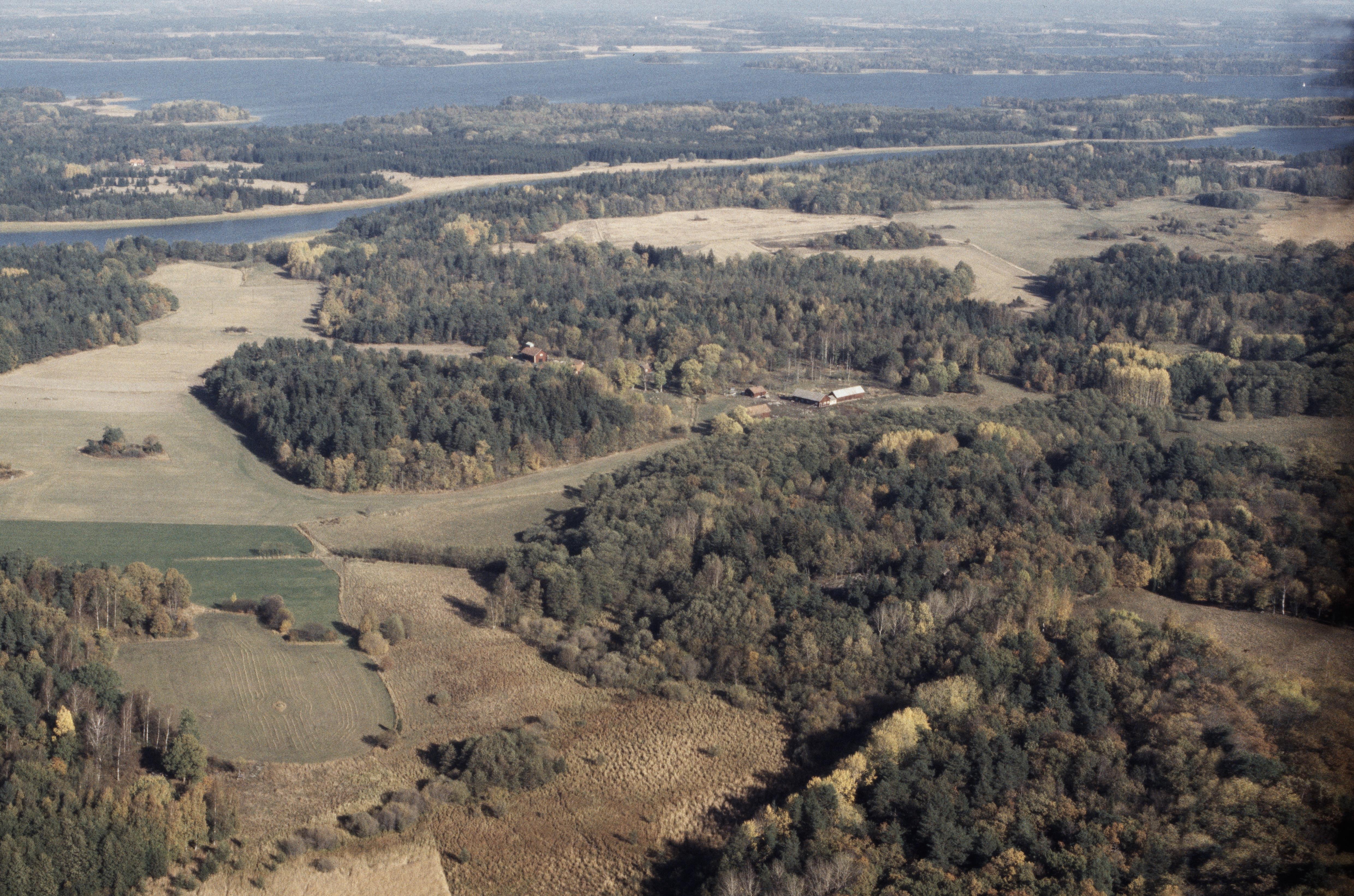 • Ön Långholmen i Mälaren. Vid bildens mitt gården Stora Långholmen. Vid stranden uppe till vänster vattenområde med båtlämning RAÄnr Ängsö 43. Bilden är tagen mot (väderstreck): NO