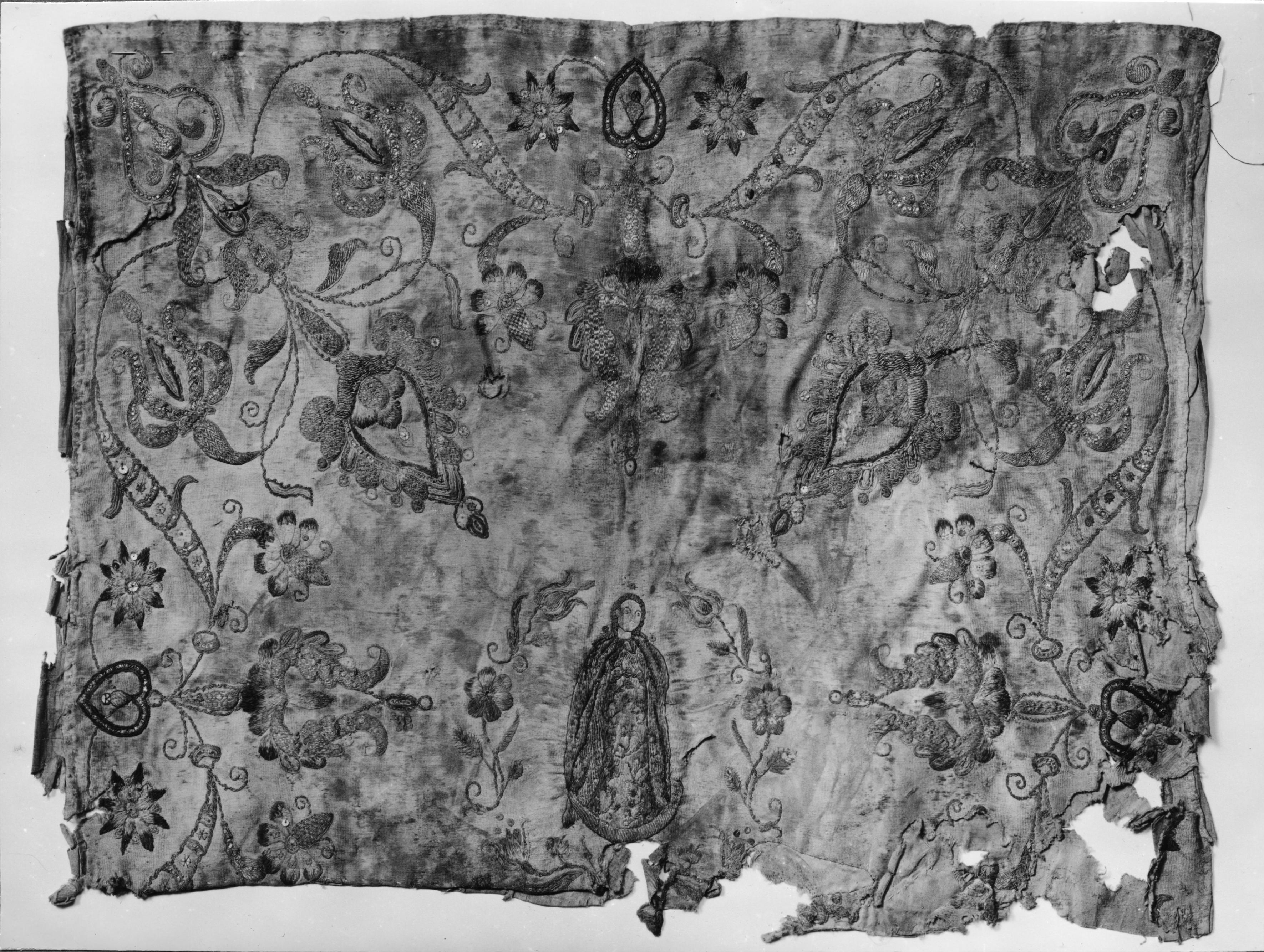 • Kalkduk. Fragmentarisk. Av nu gulbrun, ursprungligen vit, atlas med silke- och guldtråd. Något nedanför mitten inom blomsterkrans madonna på månskära. Troligen Polen, 1600-talet. Före konservering.
