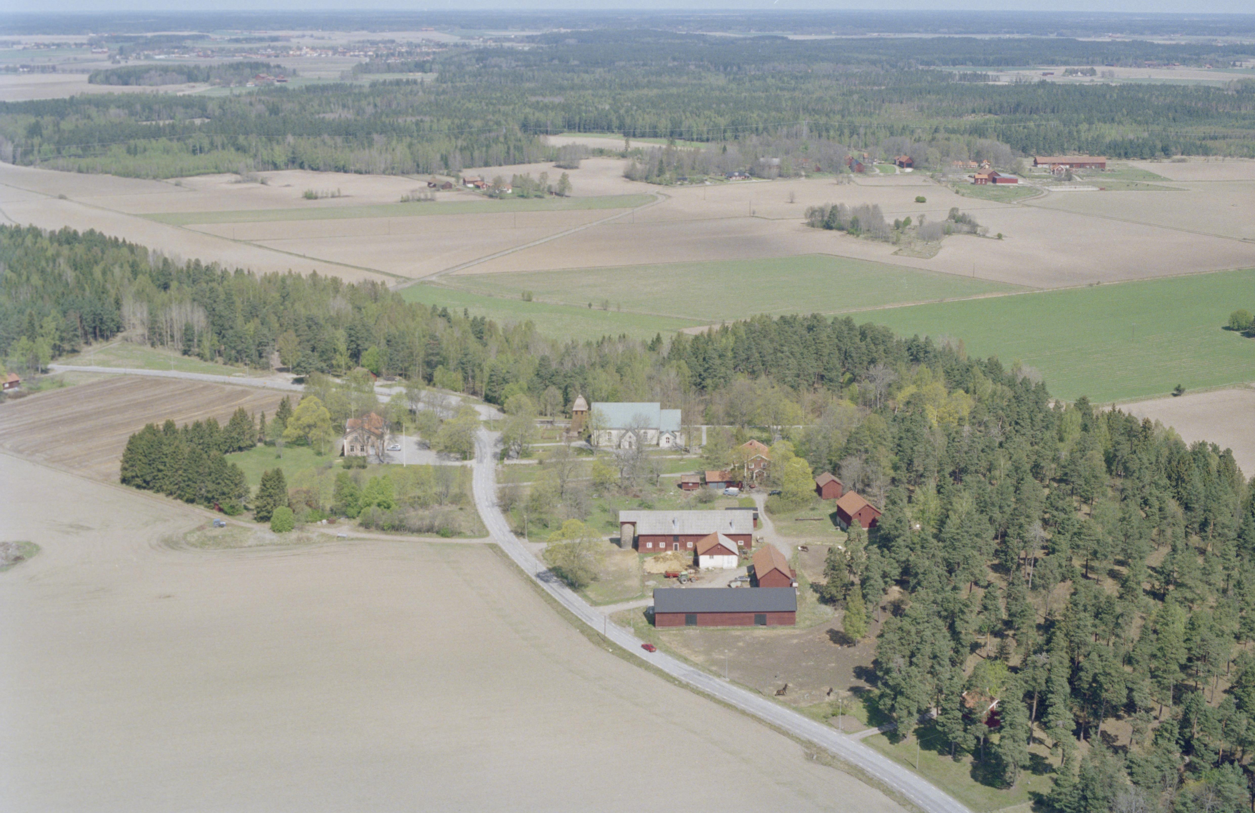 Badelunda kyrka och prästgård vid Badelundaåsen och Badelunda naturreservat. Vid kyrkan boplats RAÄnr Västerås 1040:1. Bilden är tagen mot (väderstreck): N Fotosyfte: Flygbildsdokumentation