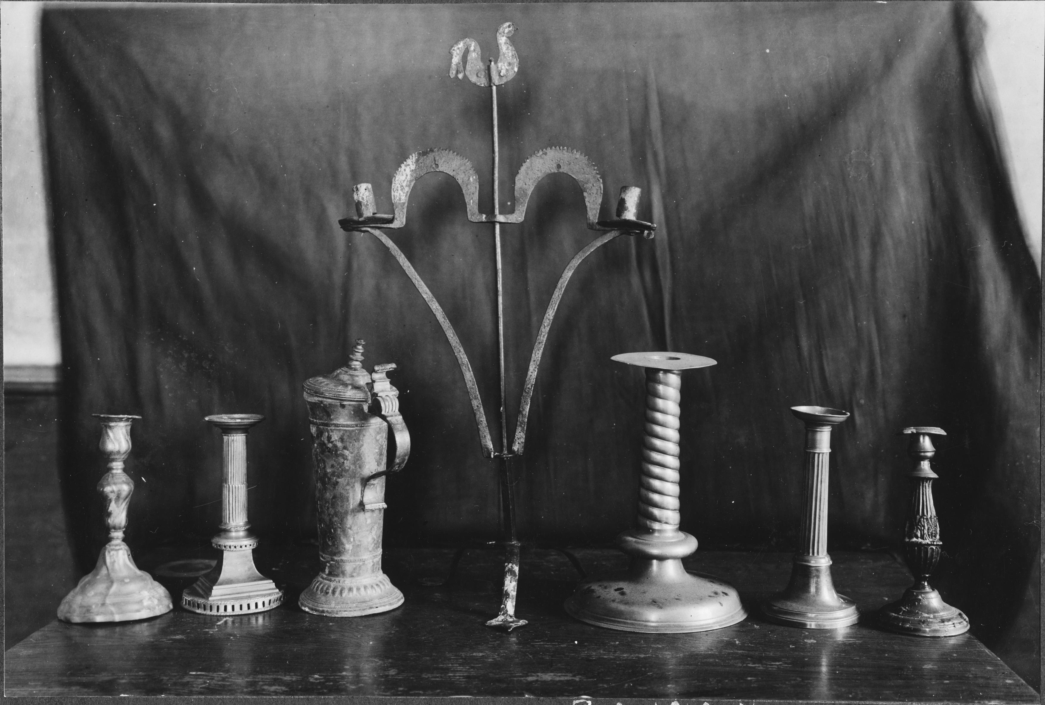 • Samlingsbild på 6 olika ljusstakar. Bland annat ljustake av järn. Ljusstake av tenn, 1600-tal.