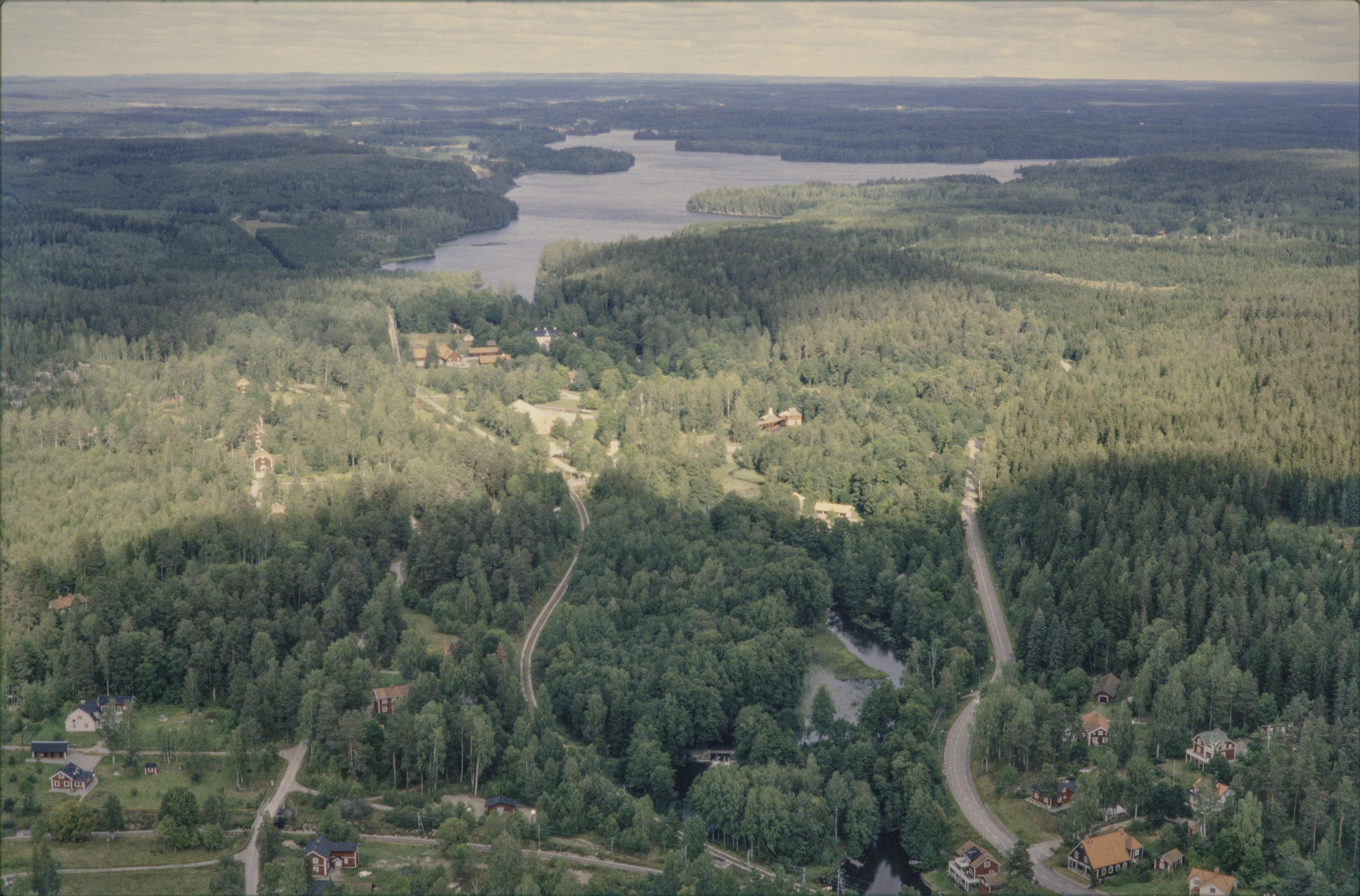 Engelsbergs bruk, byggnadsminne RAÄnr Västervåla 81:1, mellan sjöarna Snyten (i bildens övre del) och Åmänningen, norr om Ängelsbergs ort. Vid bildens mitt Engelsbergs bruksherrgård. Bilden är tagen m...