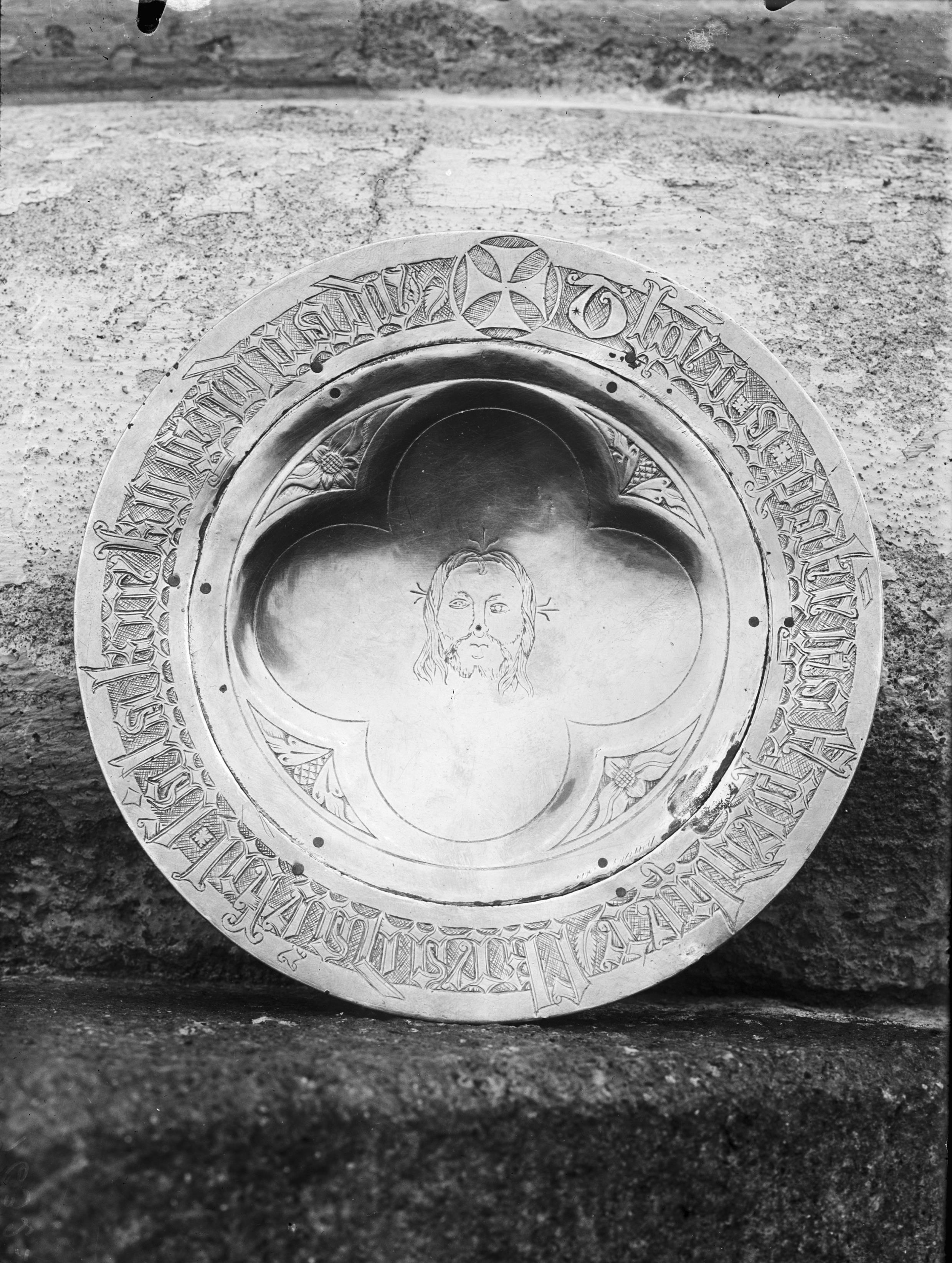 • Patén av silver, förgylld. I fördjupningen graverat Kristushuvud. I svicklarna blommor. På kanten inskrift med minuskler. Diam. 14,7 cm. 1400-talet. Snabbinv.