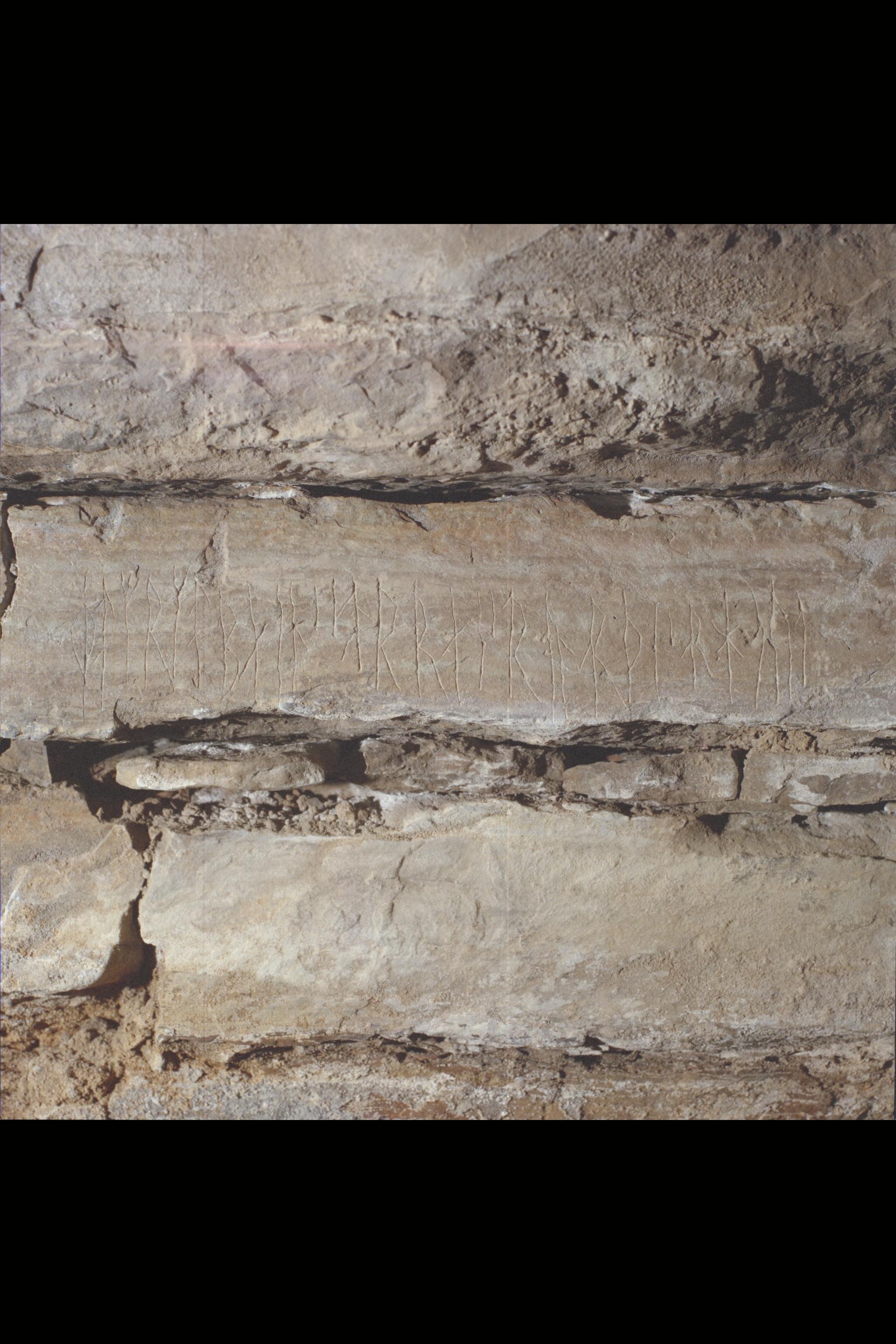 Blåfilter för dagsljusfilm i konstljus. Halogenbelysning 3400 K Illustrationer till bok av prof M Barnes: The runic inscriptions of Maeshowe, Orkney (1994), nr 2, pl. 6.