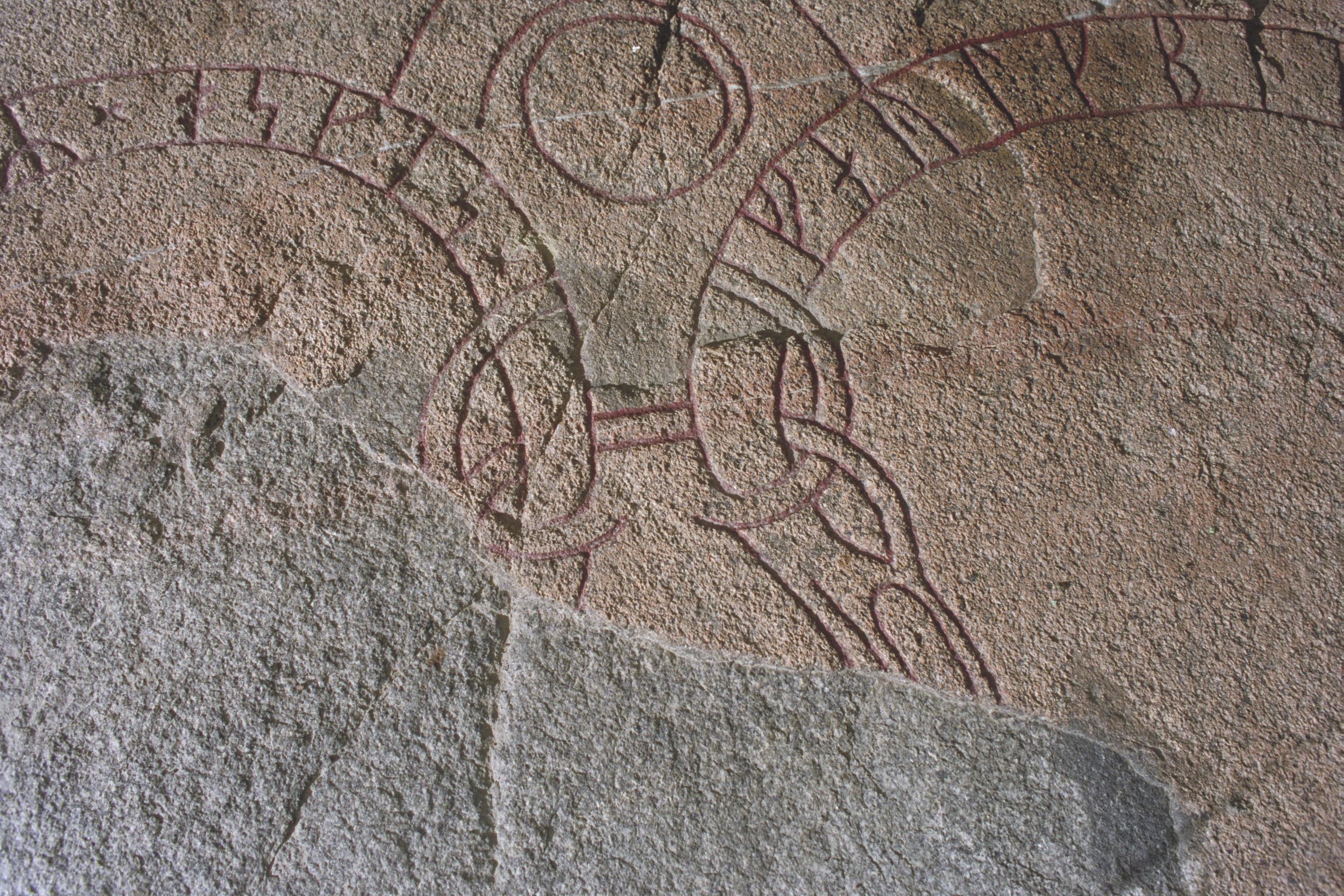 Detalj av ristningsytan på runblocket U473 med flagring. Inskriften lyder: Folkbjörn lät resa stenen efter Näv,sin broder. Det är Åsgers söner. Fotosyfte: Inv/dok