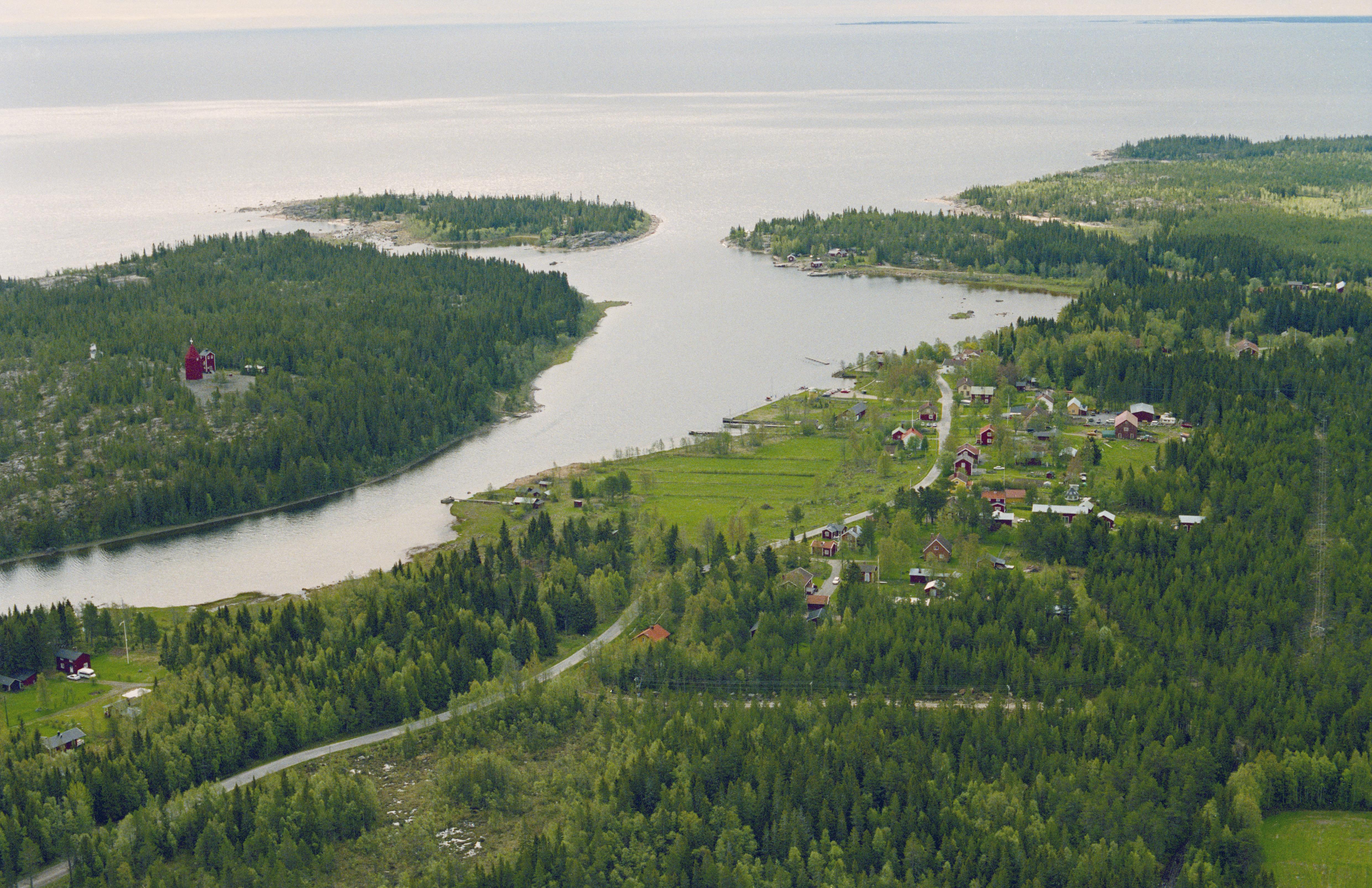 Kustbyn Ratan. Till vänster ön och naturreservatet Rataskär (Båkskäret) med husgrunder RAÄnr Bygdeå 129:1-2, labyrinter Bygdeå 7:1-2, 290:1 m.m. Vid Rataskärs fyrplats står ett röd- och vitmålat sjömä...