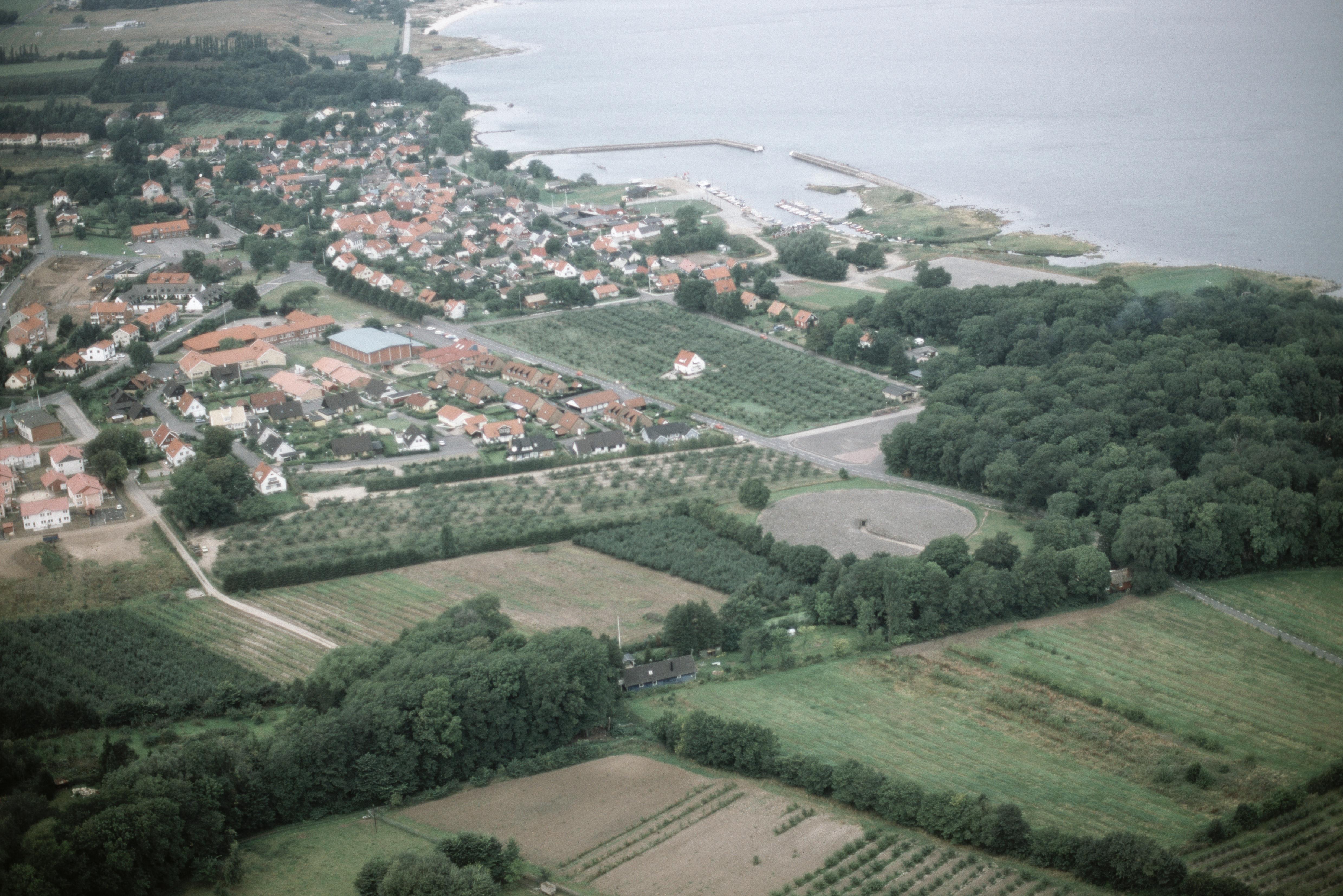 Tätorten Kivik. Kungagraven RAÄnr Södra Mellby 42:1 Kiviksgraven (Bredarör ) vid bildens mitt. Bilden är tagen mot (väderstreck): N Fotosyfte: Flygbildsdokumentation