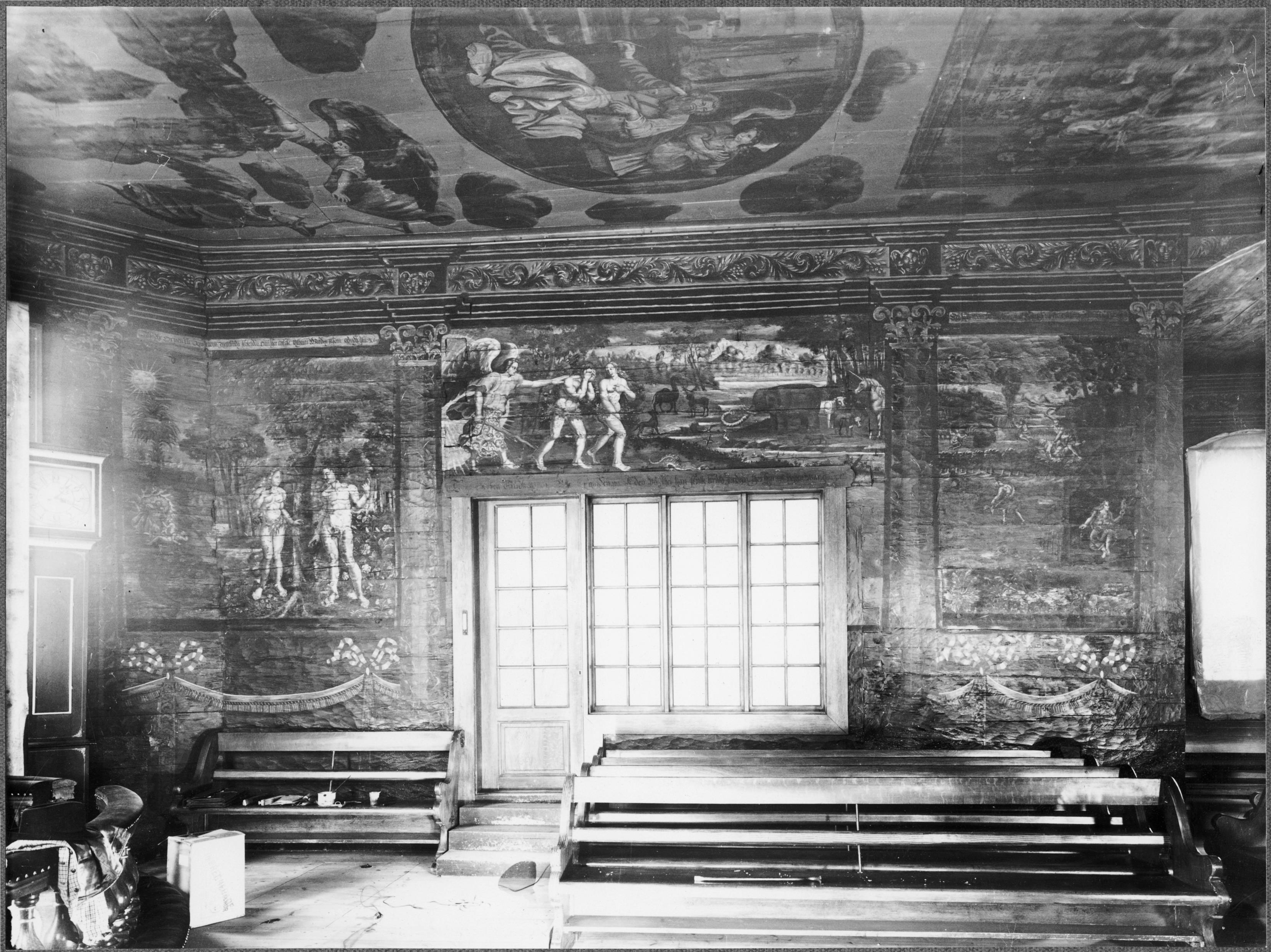 • Väggmålning på trä börjar på södra korväggen och följer runt kyrkans väggar med bilder ur gamla och nya testamentet. Före restaurering.