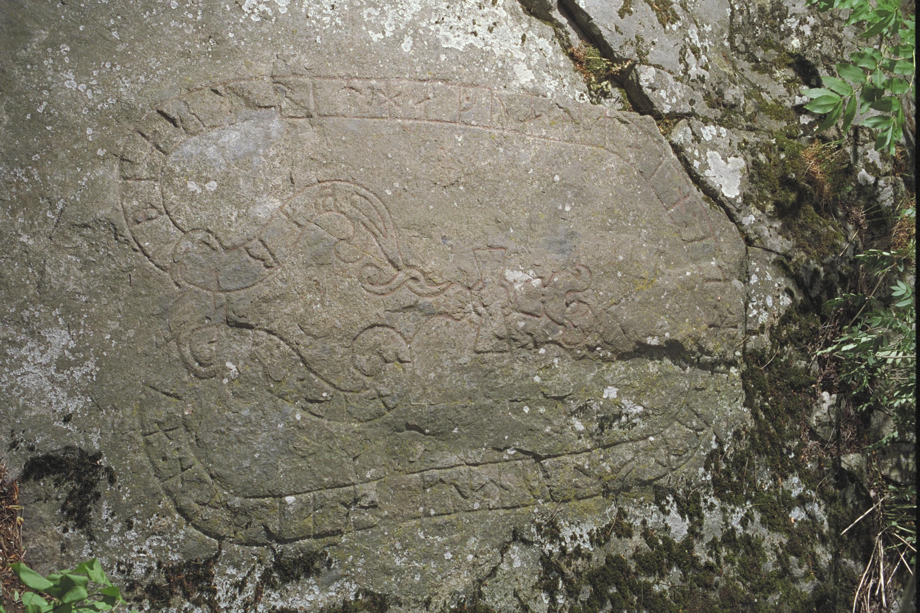 • Inskriften lyder: Farbjörn lät huggs stenen efter Håulv, sin son. Halvdan högg runorna.