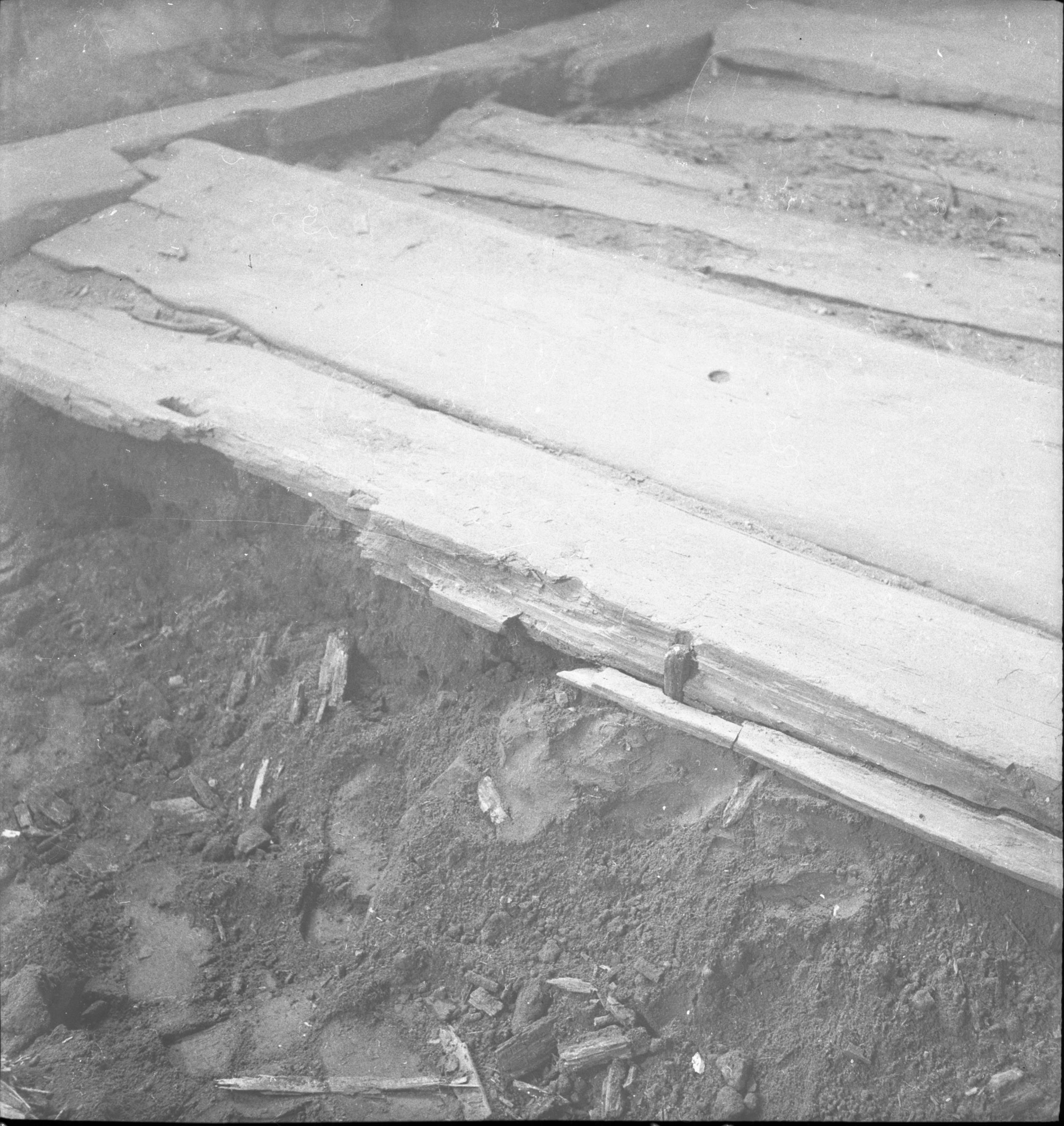 • Golvet i långhusets sydvästra hörn, en tvärplanka borttagen.