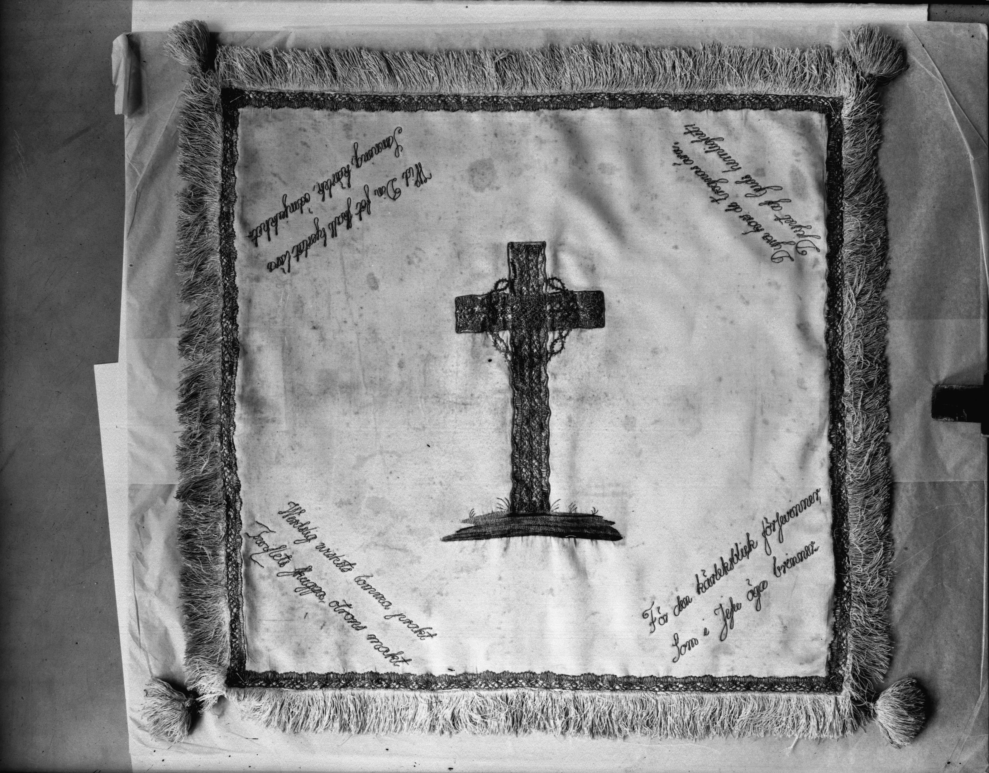 • Kalkduk, vitt siden, kantad med guldspets och silverfransar, broderi med kors och törnekrona. Efter renovering.