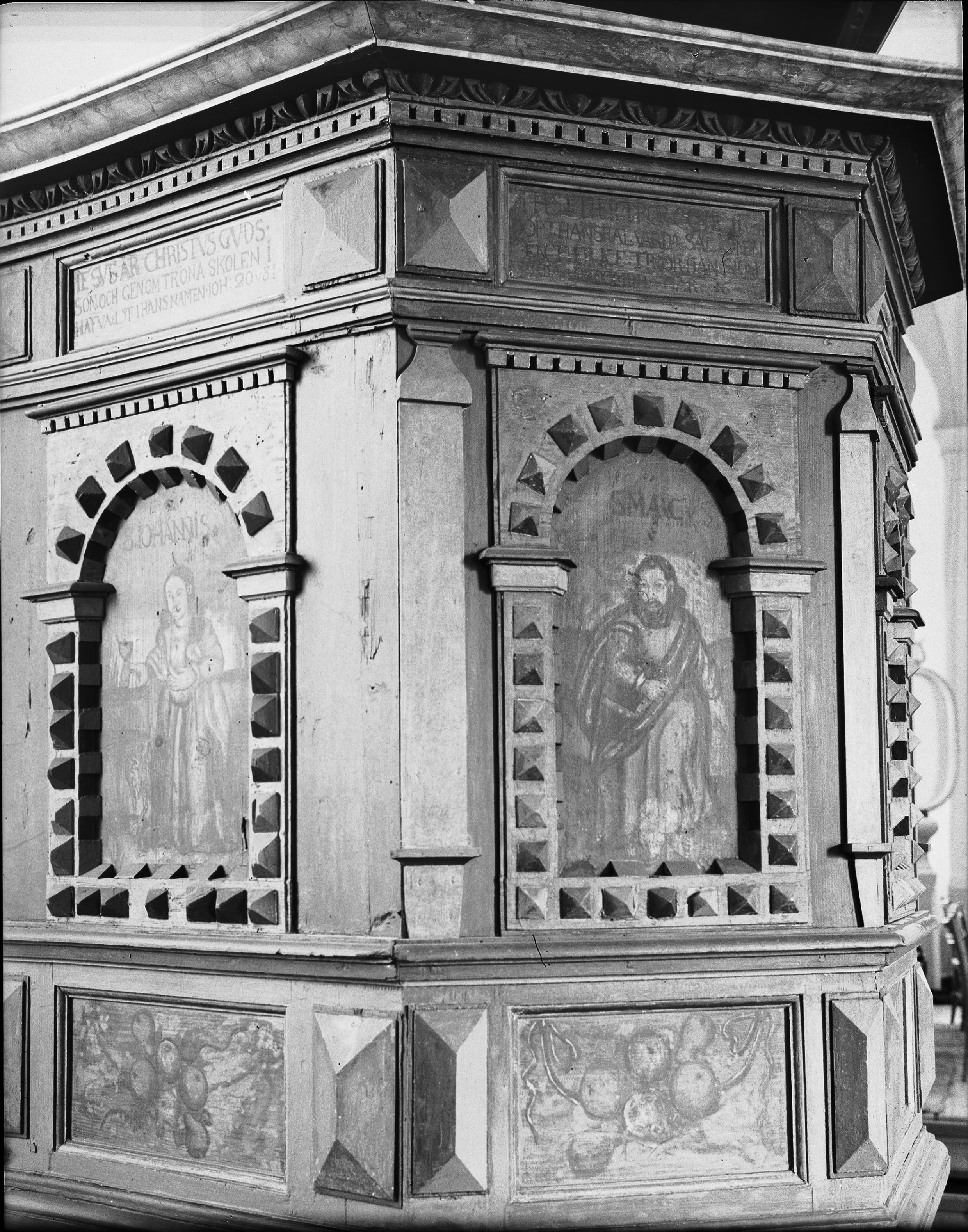 • Predikstol, 1600-talet, detalj, efter restaurering 1935-1936.