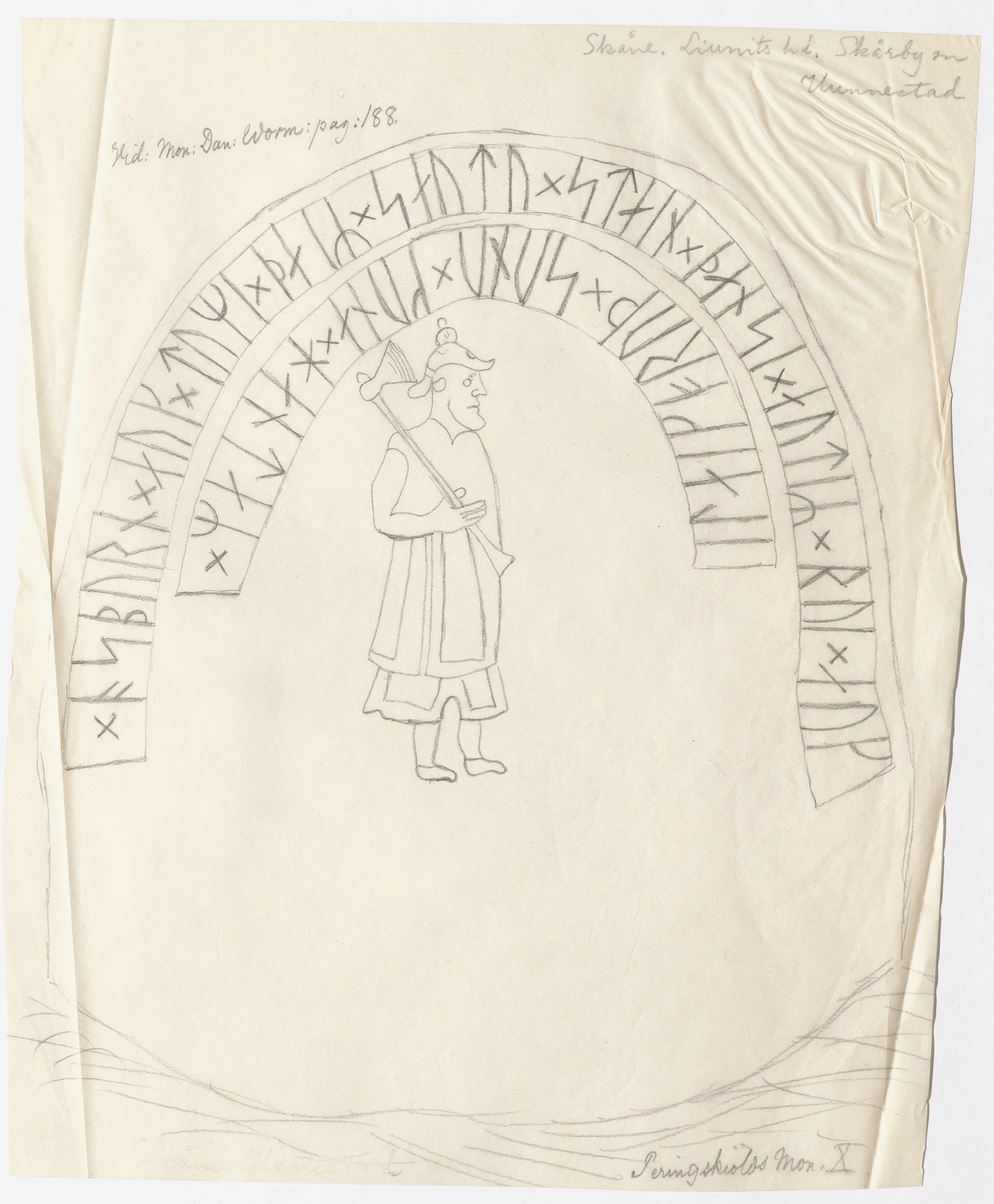 • DR 282. Upphov: Okänd (Okänt år). Bildtext: Osignerad teckning. "Vid: Mon: Dan: Worm: pag: 188. Skåne, Liunits hd, Skårby sn, Hunestad, Peringkiölds Mon X."