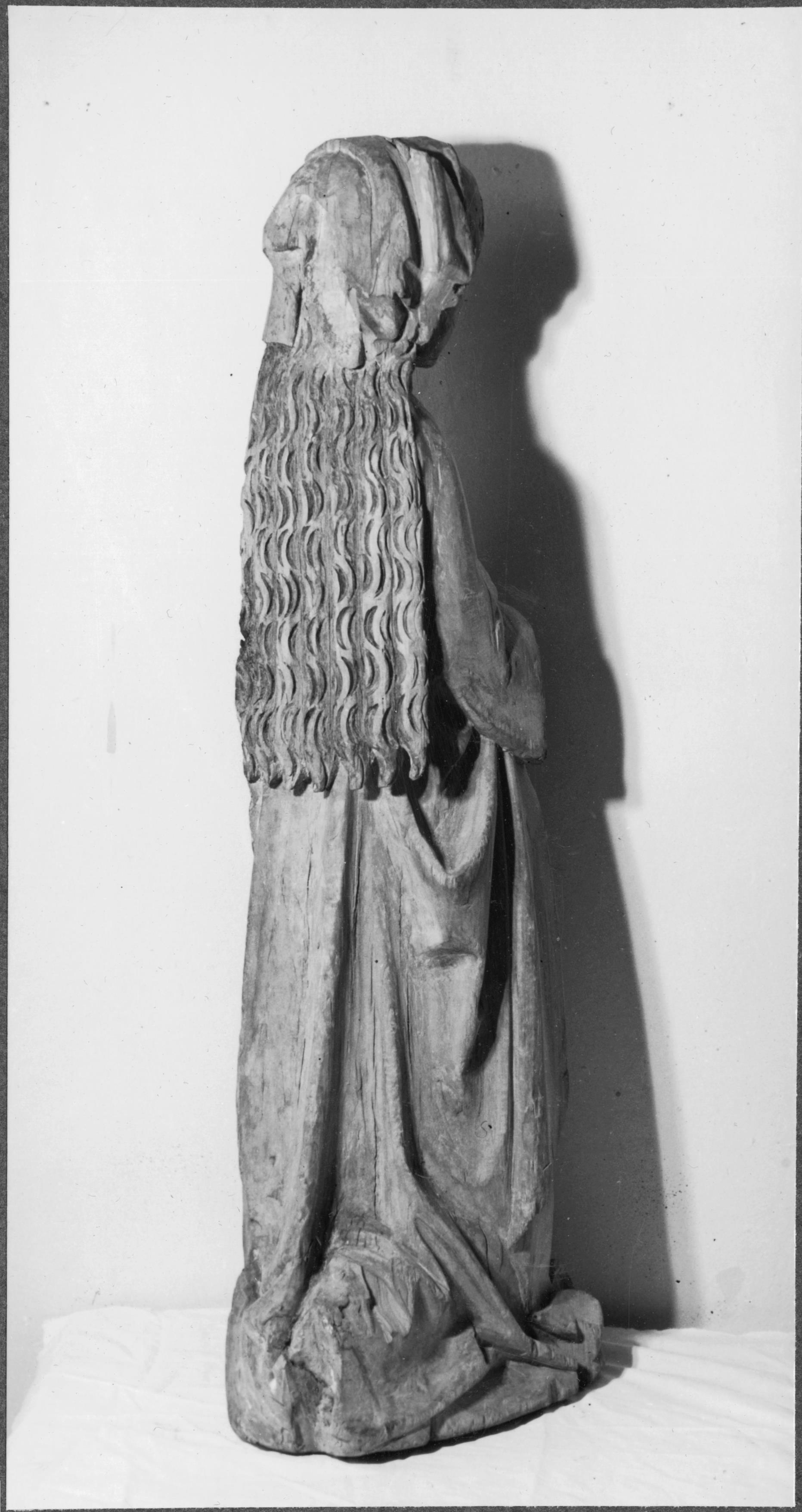 • Träskulptur föreställande ett kvinnligt helgon, 1400-talet. Efter restaurering.