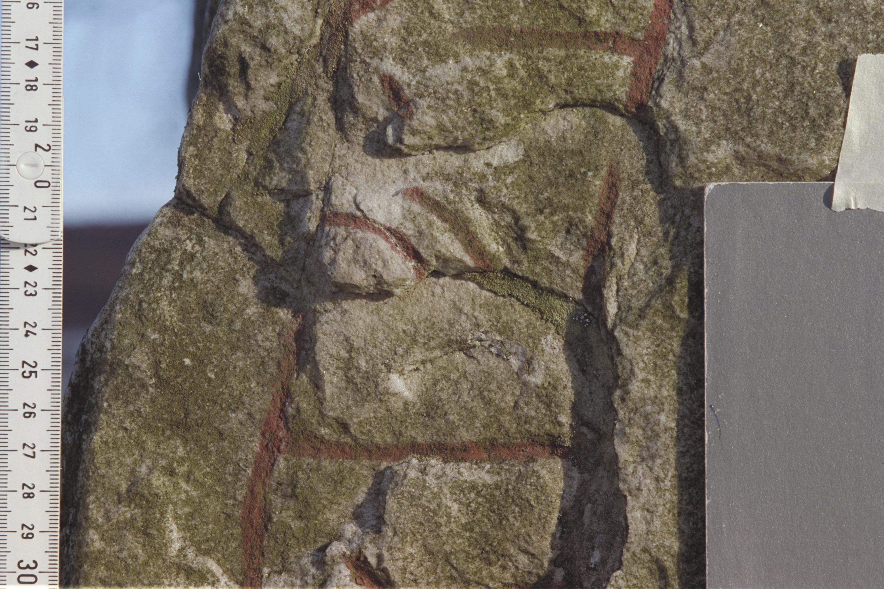 • Detaljbild med skala och gråkort av framsidan på runstenen Dr345 Simris, RAÄ-nummer Simris 1:2.