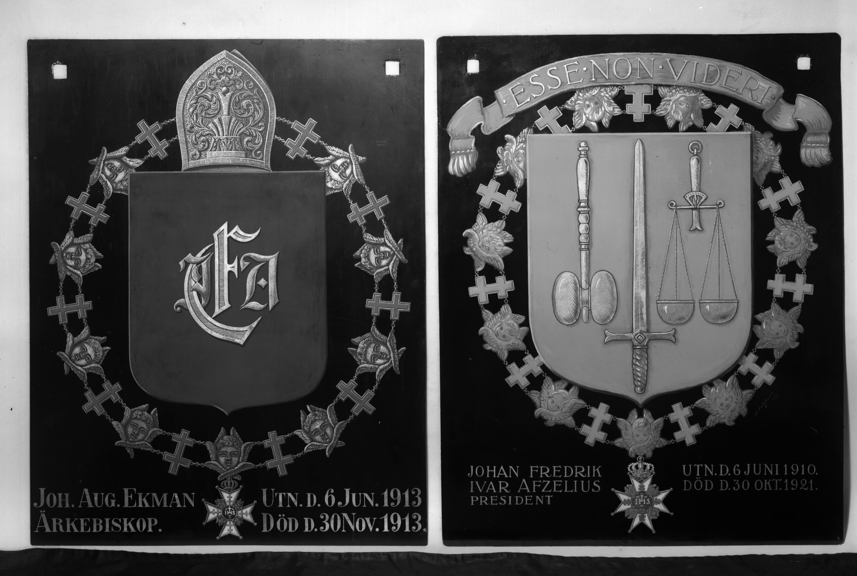 • Serafimersköldar för ärkebiskop Johan August Ekman och hovrättspresidenten Johan Fredrik Ivar Afzelius.